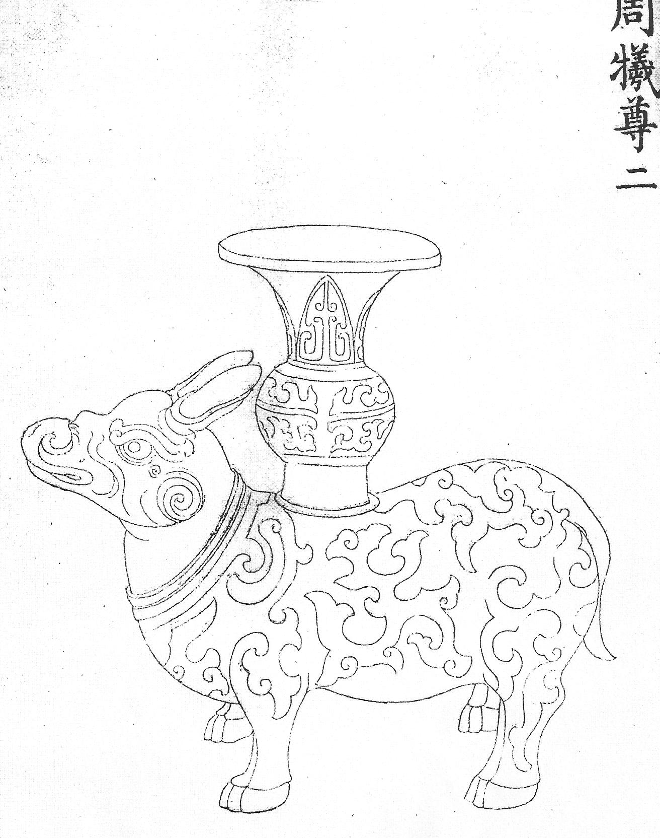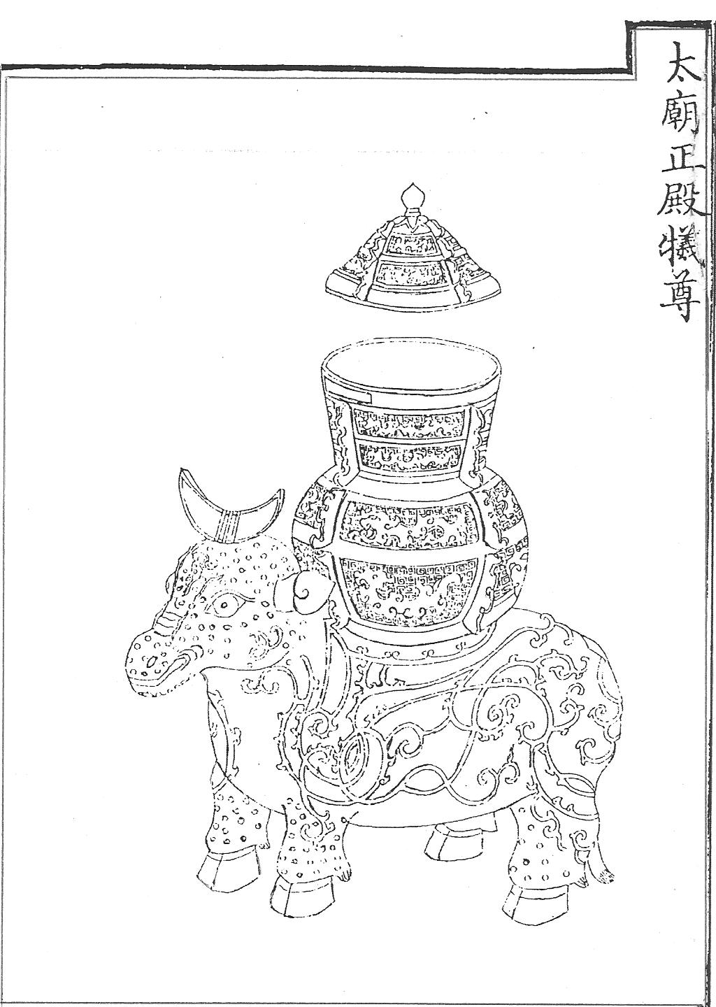 Ил.53. Ритуальный сосуд сицзунь в виде быка для жертвоприношений в храме императорских предков Таймяо. Гравюра сборника Хуанчао лици туши [158, т. 2, c. 9].В сборнике Хуанчао лици туши сообщается, что во время весенних церемоний (мэнчунь) в главном обрядовом зале Чжэндянь храма императорских предков Таймяо применялись парные сосуды в виде священного быка – сицзунь (Ил. 53).