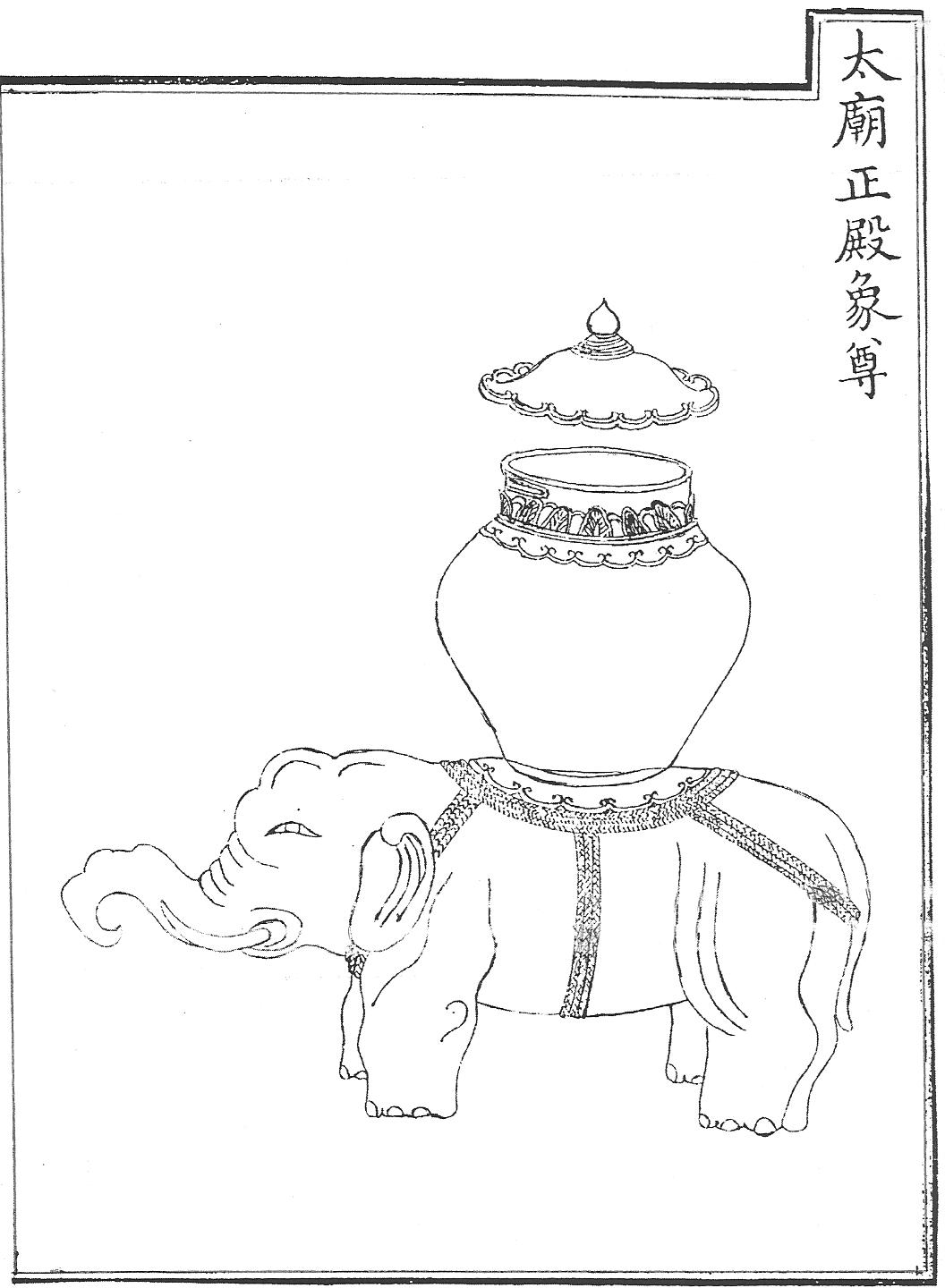 Скульптурные сосуды цзунь в виде слонов (сян) и быков (си), имевшие, как будет показано ниже, принципиально важный смысл в цинском ритуале, были установлены для жертвоприношений в храме императорских предков Таймяо в тринадцатом году правления Цяньлун (1748).