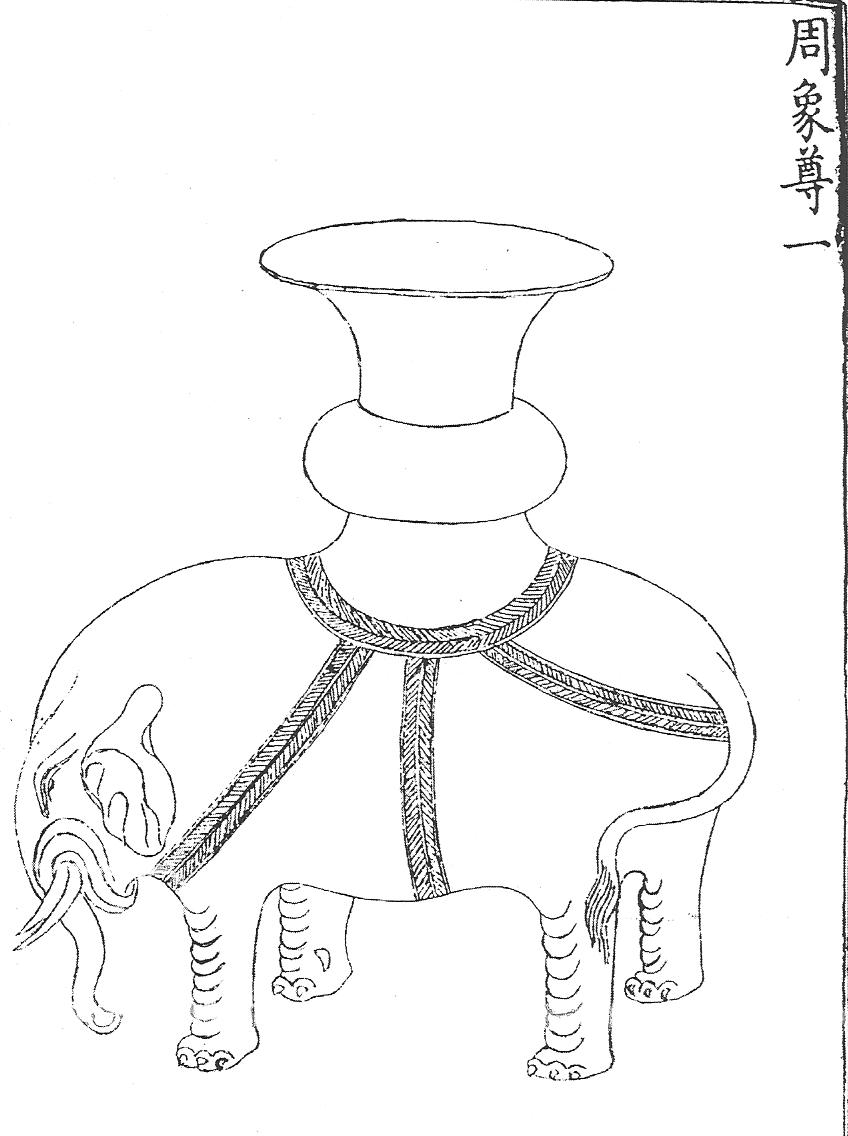 Сейчас в разных коллекциях за пределами Китая хранится несколько скульптурных сосудов в виде слона, часть которых может быть отнесена даже к более раннему – шанскому времени (например: [279, ил. 40, с. 228-230], Ил.58). По стилю эти вещи разительно отличаются от сосудов, опубликованных в каталоге Циньдин Сицин гуцзянь в составе чжоуской бронзы. Примечательно, что в комментарии к сосуду сянцзунь, сопровождающем иллюстрацию каталога, содержится указание на вероятную ошибку: «Чжоулисы цзуньи чжувэй сянцзунь чжэ ши и сяньгу цзюйи ци шичжи ци мю – Чжоулисы (Ведомство ритуала – М.Н.) объявило ритуальной утварью сянцзунь, оформленный как костяк слона, подпирающий сосуд, на основании своей (т. е. Ведомства Чжоулисы – М.Н.) ошибки» [167, т. 9, с. 25].