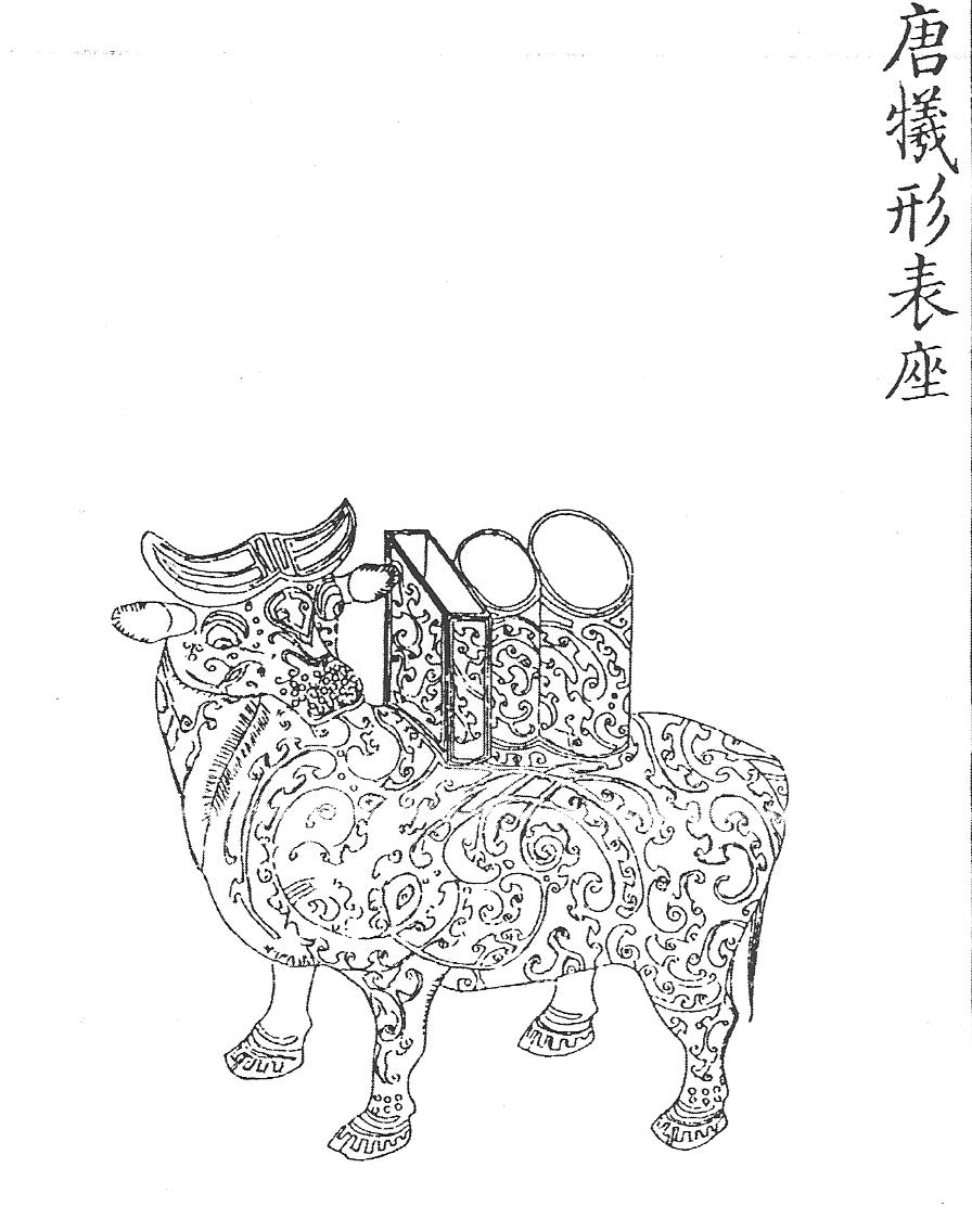 Ил.59. Бронзовый сосуд сицзунь (часть водяных часов). Эпоха Тан. Гравюра каталога Циньдин Сицин гуцзянь [167, т. 38, c. 29].Цинский ритуальный сосуд в форме быка – сицзунь в художественном отношении, как и цзунь в виде слона, представляется вариантом минского образца в «чжоуском стиле», который в каталоге Циньдин Сицин гуцзянь тоже датируетсяпериодом Чжоу [167, т. 9, с. 29] (Ил.56). При этом в сосуде маньчжурского времени обнаруживается определенное сходство также с близкой по композиции и декору танской вещью, особенно заметное в трактовке головы быка и орнаментальной отделке фигуры [167, т. 38, с.29] (Ил.59).