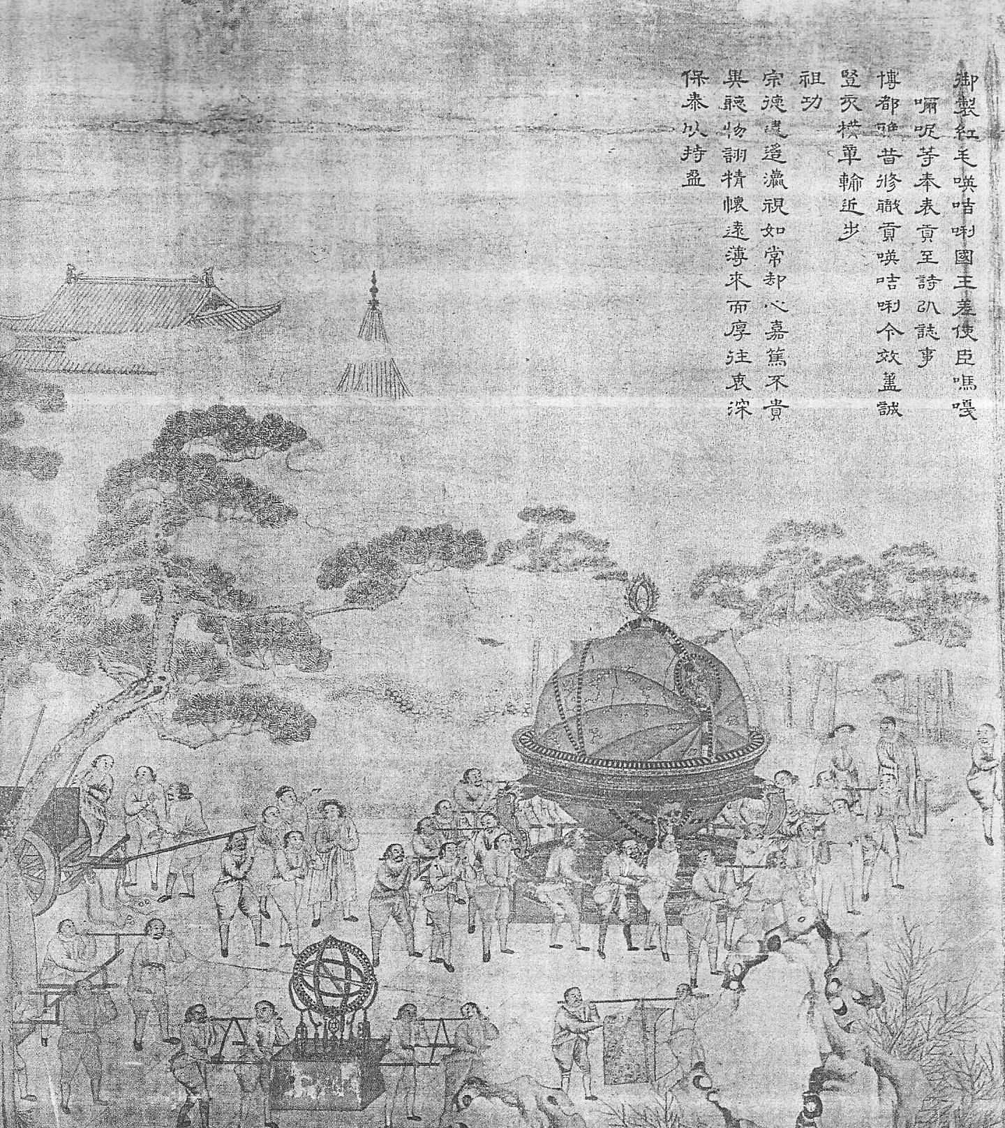 Ил.67. Фрагмент ковра с изображением европейских послов, несущих дары китайскому императору. Шелк, ткачество. Китай, период Цяньлун (около 1794). Национальный морской музей, Гринвич [206, с. 178 - 179].Посещение императора Цяньлуна дипломатической миссией лорда Маккартни (1793), доставившей в Пекин среди различных даров часы и небесный глобус, отражено (около 1794) в серии китайских шелковых ковров, находящихся в собрании Национального морского музея в Гринвиче (Ил.67). В композиции одного из ковров показаны европейцы, несущие небесный глобус и армиллярную сферу. Образцами астрономических приборов китайским художникам послужили, по-видимому, предметы, изготовленные в годы Канси для пекинской обсерватории Ф. Фербистом и зафиксированные в законах Цяньлуна, как будет показано в следующей главе. Поэтому изображения на ковре заметно отличаются по виду от реальных подарков Георга Английского, представленных в карандашном наброске Вильяма Александера [206, ил. 112].