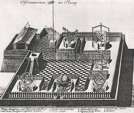 Рис.3. Обсерватория в Пекине. Гравюра на меди из книги иезуита Ж.-Б. дю Альде (1749).Пребывание европейских миссионеров на Дальнем Востоке в течение XVII-XVIII веков и просветительская линия поведения, принятая за основу иезуитами, должны были привести к адаптации в Китае христианского учения, приспособленного к его нравам и обычаям. Но реальные плоды этой деятельности оказались качественно иными, поскольку в результате были заложены основы для последующего введения Китая в мировую науку и культуру. Первыми среди католических миссионеров прибывшие в Китай из некоторых европейских стран (Португалии, Италии, позднее – Франции) иезуиты обладали глубокими научными и практическими познаниями, поэтому они пользовались особенным и, без сомнения, заслуженным уважением в Срединной империи. Иезуиты нашли верный путь к пекинскому двору, стараясь стать нужными китайским императорам и завоевать признание своей веры посредством услуг в области науки и технологии. Всесторонняя образованность позволяла им, не забывая о целях ордена, демонстрировать в Китае возможности европейской цивилизации и, вместе с тем, изучать и анализировать классические конфуцианские тексты, китайские обычаи и образ жизни. Добиваясь расположения представителей ученого и господствующего класса, миссионеры постепенно проникали в китайское общество, прокладывая, как им казалось, путь для укрепления авторитета ордена и распространения христианства < 27>.