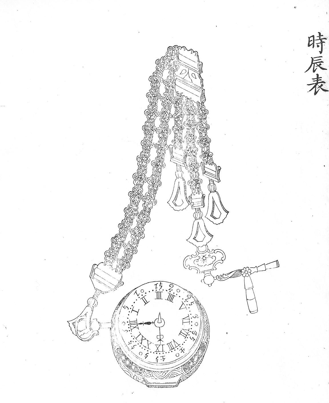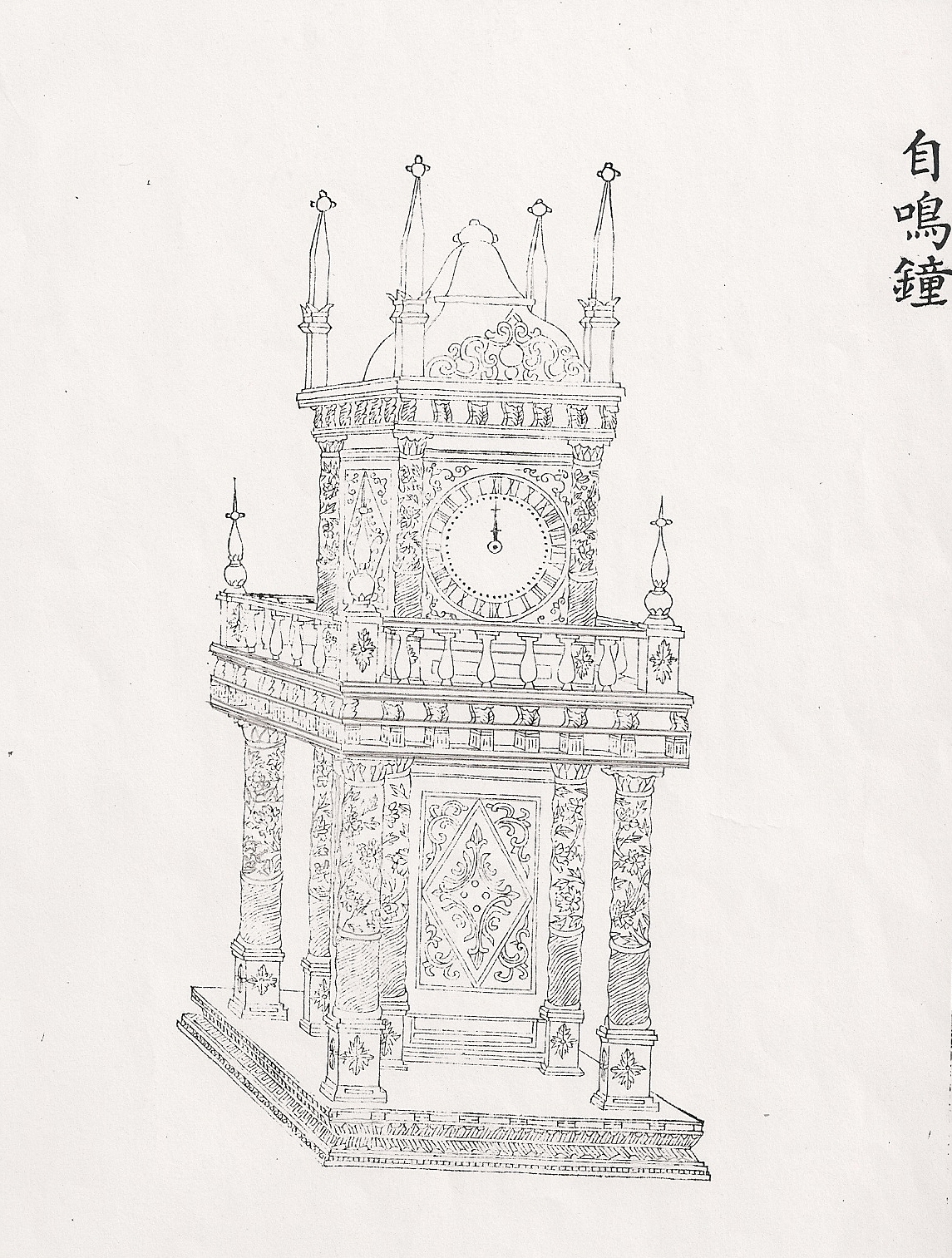 Механические часы, фигурирующие в цинских законах, относятся к двум типам – этокуранты (цзыминчжун) и поясные часы на шатлене (шичэньбяо). Как указано в комментарии к рисунку, данному в своде Хуанчао лици туши, куранты действуют благодаря системе из трех стальных зубчатых колес, вращение которых синхронизировано с движениями стрелок и ударами колокола [158, т. 3, с. 68 – 69].