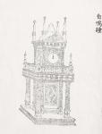 Ил.78. Европейские механические куранты. Гравюра из сборника Хуанчао лици туши [158, т. 3].Куранты (Ил.78) заключены в прямоугольный корпус с колоннами по углам, украшенный узором из золотых цветов (цзиньхуавэнь), они снабжены круглой формы циферблатом со стеклянным колпаком в передней части корпуса. На циферблате, который, согласно описанию, должен быть разделен на двенадцать частей, короткая стрелка (дуаньчжэнь) указывает часы, совершая полный оборот дважды в сутки, длинная стрелка (чанчжэнь) отсчитывает минуты. Куранты озвучивают четверти и каждый час, отбивая соответствующее число ударов. Примечательно, однако, что куранты на рисунке в Хуанчао лици туши изображены китайским художником не с двенадцатью, а с двадцатью четырьмя часовыми делениями на шкале, что, искажая обычный вид циферблата, в то же время подчеркивает соответствие официально утвержденных курантов западным стандартам счета времени.