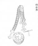 Ил.79. Европейские механические часы на поясном брелоке – шатлене. Гравюра из сборника Хуанчао лици туши [158, т. 3].Поясные часы на шатлене по закону должны быть выполнены из золота, иметь круглый циферблат, поделенный на двенадцать равных отрезков, и две стрелки – часовую и минутную. Корпус часов, закрепленный на золотых ажурных подвесках с цветочным узором (лоухуавэнь) следовало украшать различными драгоценными камнями. По своему устройству механизм карманных часов, требующий регулярного завода, тот же, что и в курантах [158, т. 3, с. 70] (Ил.79).