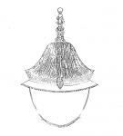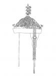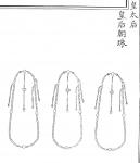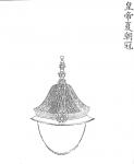 Ил.94. Летний головной убор чаогуань императора с набором ранговых украшений (вид сзади). Гравюра сборника Хуанчао лици туши [158, т. 4].У наиболее знатных аристократов из рода императора головные уборы чаогуань завершались двухъярусными навершиями - эрцэндин с золотыми изображениями драконов – цзиньлун. На летних головных уборах аристократов помещались кокарды шэлинь, инкрустированные жемчужинами (спереди), и маленькие золотые цветочные розетки цзиньхуа (сзади). Ранговые различия в украшениях аристократов обозначались тем или иным количеством жемчужин на кокарде.