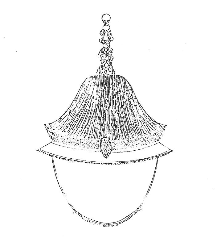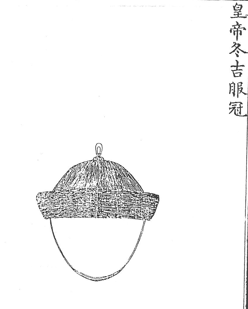 Ил.95. Зимний официальный головной убор цзифугуань императора с навершием дин, обозначающим ранг (вид спереди). Гравюра сборника Хуанчао лици туши [158, т. 4].В официальных головных уборах цзифугуань (зимних и летних одинаково) императора (Ил.95), ванов и гунов, а также чиновников девяти рангов навершие дин имело вид округлой бусины – чжу в металлической оправе (обычно в форме цветочной розетки). В бусинах использовались перечисленные выше материалы, которые служили показателем ранга.