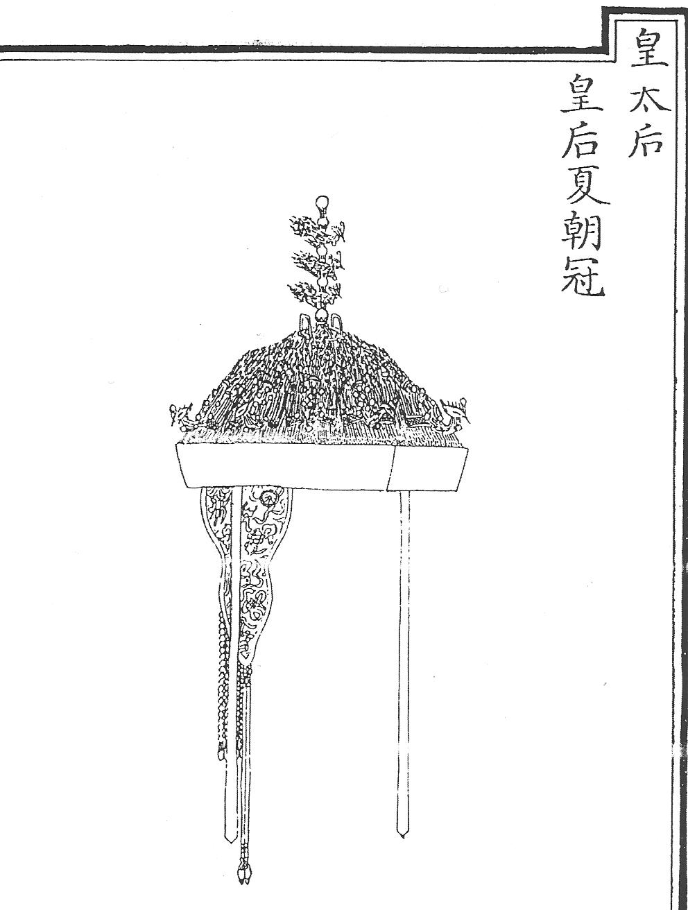 Ил.100. Летний ритуальный головной убор чаогуань императриц с набором ранговых украшений (вид сзади). Гравюра сборника Хуанчао лици туши [158, т. 6].Число декоративных элементов убора чаогуань персон, стоящих по положению ниже императриц и наложниц высших рангов, постепенно убывало. Так, у наложниц фэй и пинь навершие дин было двухъярусным, вокруг убора располагалось пять фениксов – цзиньфэн.