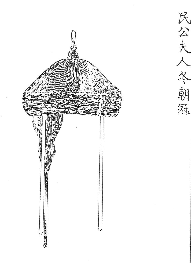 Ил.101. Зимний ритуальный головной убор чаогуань жены миньгуна (миньгун фужэнь) с набором ранговых украшений (вид спереди). Гравюра сборника Хуанчао лици туши [158, т. 7].У знатных женщин, не принадлежавших к роду императора, вместо изображений птиц в навершии дин убора чаогуань применялись золотые розетки-цзиньхуа. Кроме розеток показателями ранга для этих особ были украшения цзань, записанные тем же иероглифом, что и однозубая шпилька цзань – древнейший вид китайского головного украшения.