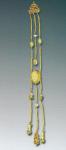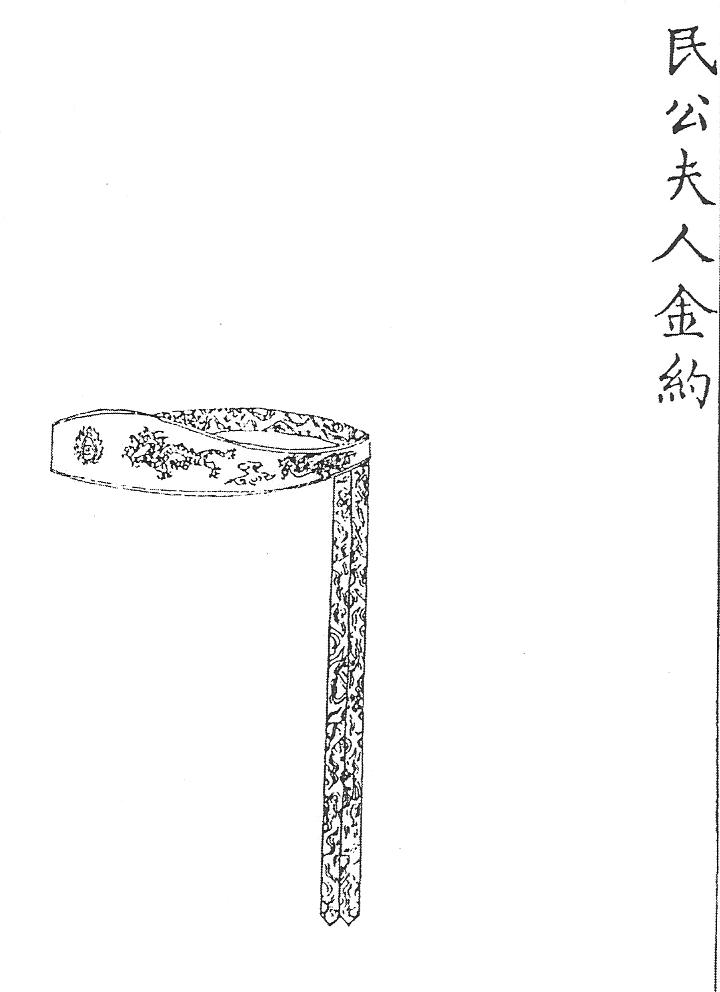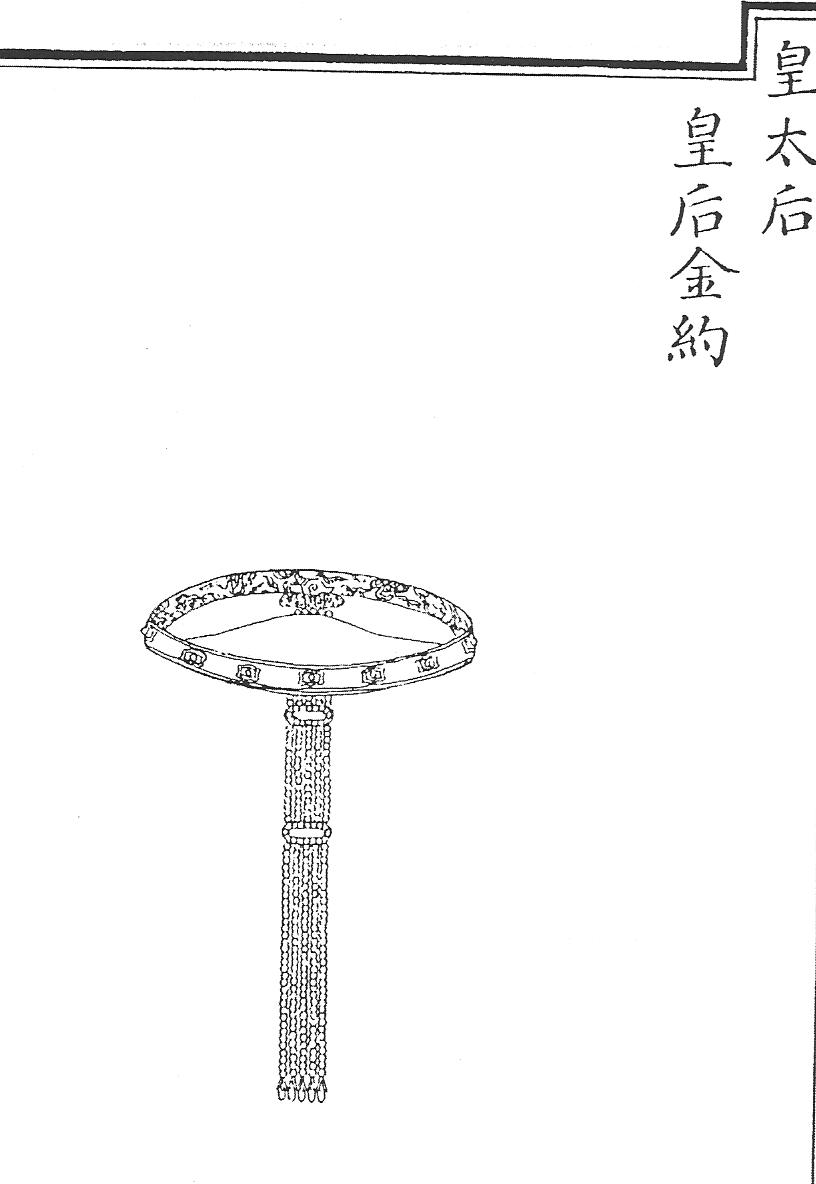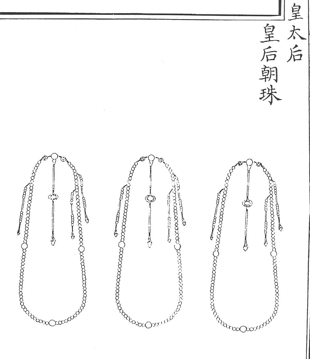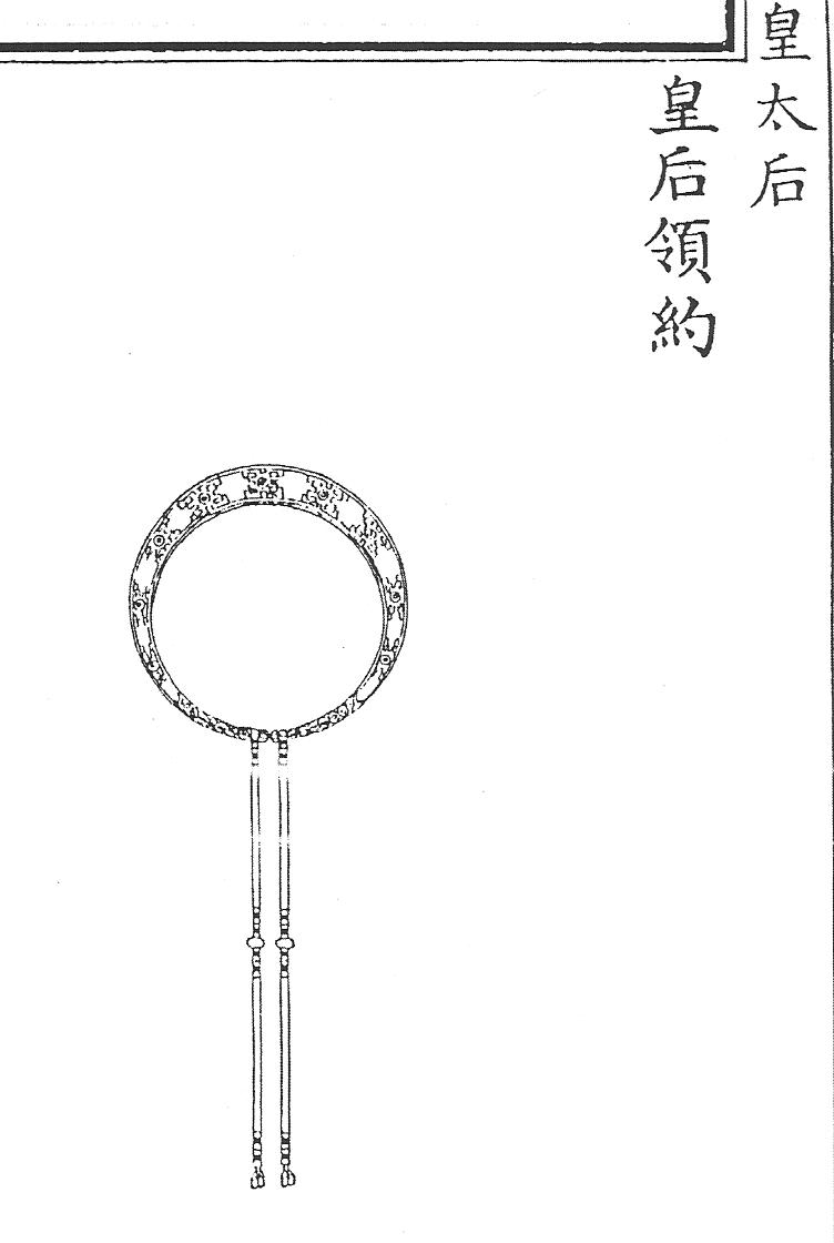 Ил.106. Гривна линъюэ – часть убора чаогуань императриц. Гравюра сборника Хуанчао лици туши [158, т. 6].Императрицы хуантайхоу и хуанхоу имели право носить одно жемчужное и два коралловых чаочжу, тогда как наложницы императора, начиная с хуангуйфэй, принцессы и аристократки не ниже фугогун фужэнь, надевали одно янтарное и два коралловых ожерелья [158, т. 6, с. 24, 43].