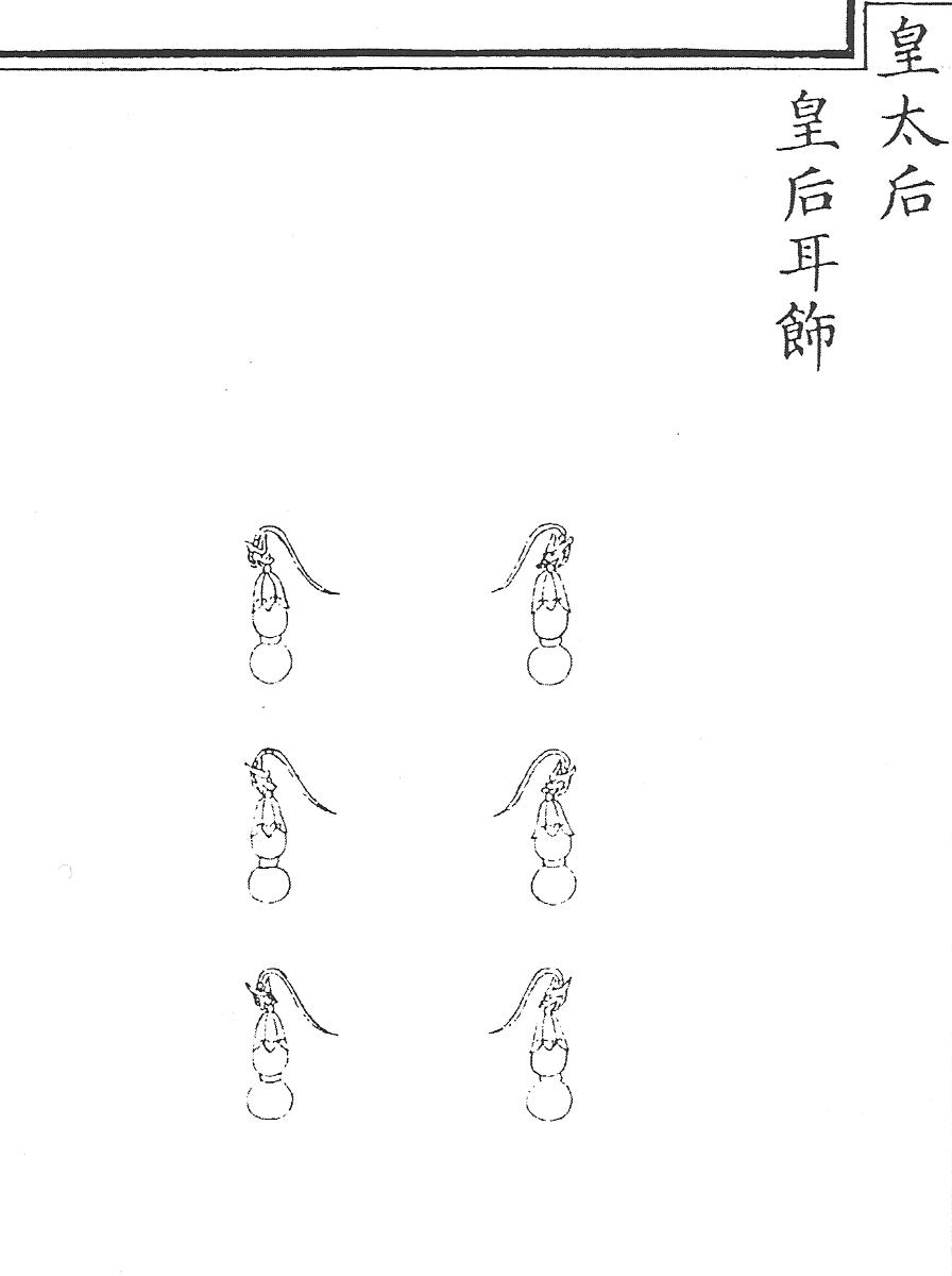 Ил.104. Комплект серег эрши – часть убора чаогуань императриц. Гравюра сборника Хуанчао лици туши [158, т. 6].Ушные украшения женщин, такие как серьги, в цинское время использовались в наиболее торжественной форме костюма – ритуальном одеянии чаофу. Серьги хулуэрхуань в виде двойной тыквы, нашедшие применение в ансамбле костюма знати уже в период Мин, были предусмотрены законом цинского времени для императриц, наложниц императора, аристократок и чиновных дам всех рангов. В костюме чаофу наиболее высокопоставленных особ такие серьги выполнялись из золота и жемчуга, и их следовало носить по три в мочке каждого уха (Ил.104). У императриц, наложниц императора и жены наследника (хуантайцзыфэй), согласно закону, жемчужины должны были крепиться к изображению золотого дракона – цзиньлун, тогда как другие дамы, начиная с жены императорского сына (хуанцзы фуцзинь), могли носить подобные серьги из жемчуга с оправой в форме золотого облака – цзиньюнь, что, по-видимому, не всегда соблюдалось в реальности.