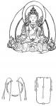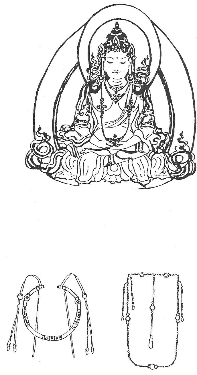 Ил.107. Вверху: Прорисовка системы украшений буддийского божества (с живописных изображений XVIII-XIX вв. [97, с. 193]). Внизу: Прорисовка украшений костюма чаофу маньчжурских императриц – гривна и ожерелье [170, с. 509].Непременным атрибутом ритуального и официального костюмов были украшения шеи и груди; к важнейшим из них относится длинное ожерелье чаочжу, представляющее собой комбинацию бус и подвесок (Ил.107). Нить чаочжу состояла из ста восьми одинаковых по размеру круглых бусин и разделялась вставками большего размера на четыре равные части. Сзади к бусам крепилась лента с крупной округлой подвеской в середине, которая лежала на спине и называлась фотоу («голова Будды»). Лента заканчивалась бусиной в форме тыквы-горлянки хулу, образно именуемой фота («пагода»). Вся эта композиция на ленте получила название бэйюань («облака [за] спиной», «северные облака»). Когда ожерелье надевали, спереди, с двух сторон от его центра, свисали три асимметрично расположенные нити мелких бус (две – на левом плече, одна – на правом), называвшиеся цзинянь («отмечать годовщину») [165, с. 55, 177] (ил. I-4.1). Материалами для чаочжу служили жемчуг, коралл, лазурит, бирюза, янтарь, агат красных тонов или сердолик (манао), горный хрусталь, рубин, сапфир, нефрит (юй), а также дерево и стекло.
