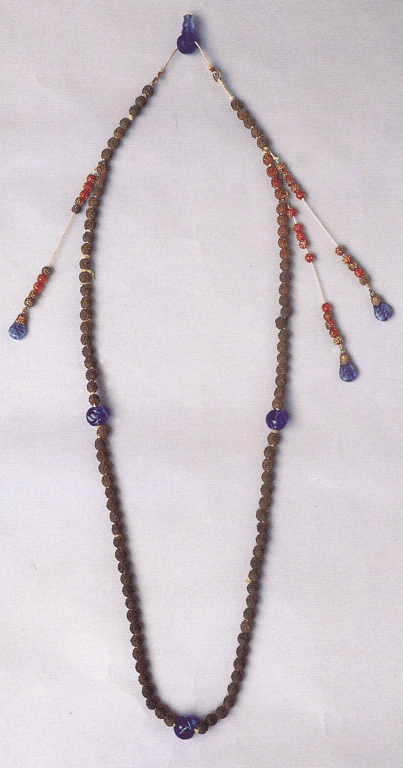 Ил.108. Буддийские четки – прообраз цинского придворного ожерелья чаочжу. Сандал, резьба. Китай, конец эпохи Мин [156, с. 195].Аналогичное по форме буддийским четкам ожерелье чаочжу не случайно стало основным компонентом цинского придворного и ритуального костюма. Опубликованные четки периода Мин дают основания утверждать, что типологически чаочжу не является маньчжурским изобретением (Ил.108). Новшество заключалось лишь в том, что четки, которые считались непременным атрибутом буддийских священослужителей и даже принадлежали к немногим вещам, составлявшим личную собственность монахов, были применены как официальное украшение. Введение этого необычного по форме и семантике предмета в ансамбль ритуального и придворного костюма представляется своеобразной декларацией не только светской, но и духовной власти и вызывает сравнение правителей цинской династии с тибетской теократией. О том, что в маньчжурский период ритуальное ожерелье сохранило и свое прямое назначение, свидетельствует портрет одной из цинских императриц, изображенной во время медитации или поста и перебирающей чаочжу, как четки [165, с. 26, ил.18].