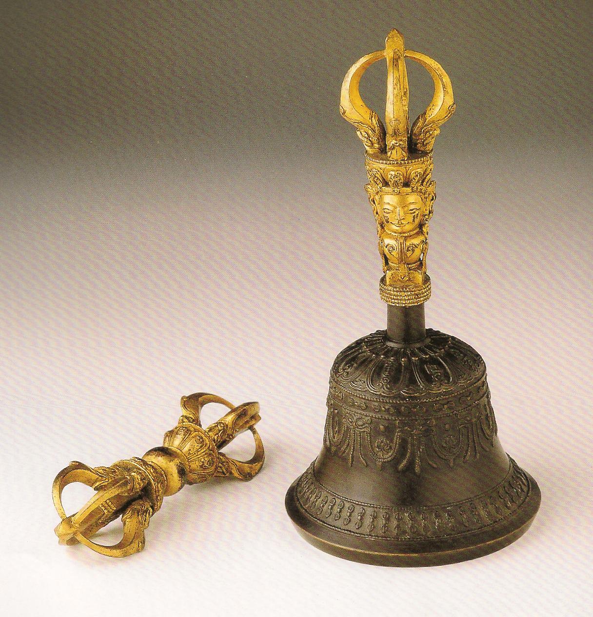Ил.110. Атрибуты ламаистского культа – колокольчик и скипетр-ваджра. Бронза, литье, золочение. Тибет, первая треть XV в. (Подарены далай-ламой VIII Цяньлуну в 1770 по случаю шестидесятилетия императора) [175, ил. 30].