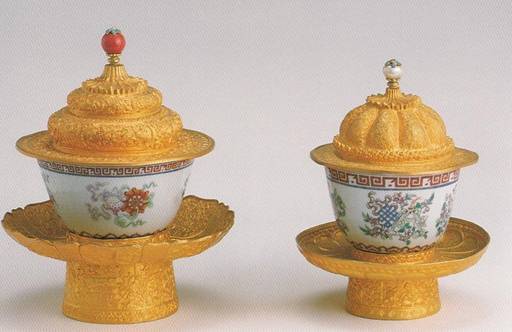 Ил.115. Пара китайских фарфоровых чашек. Оправа – золото, чеканка, гравировка. Тибет, XIX в. Тибетский музей, Лхаса [282, с. 48].