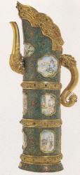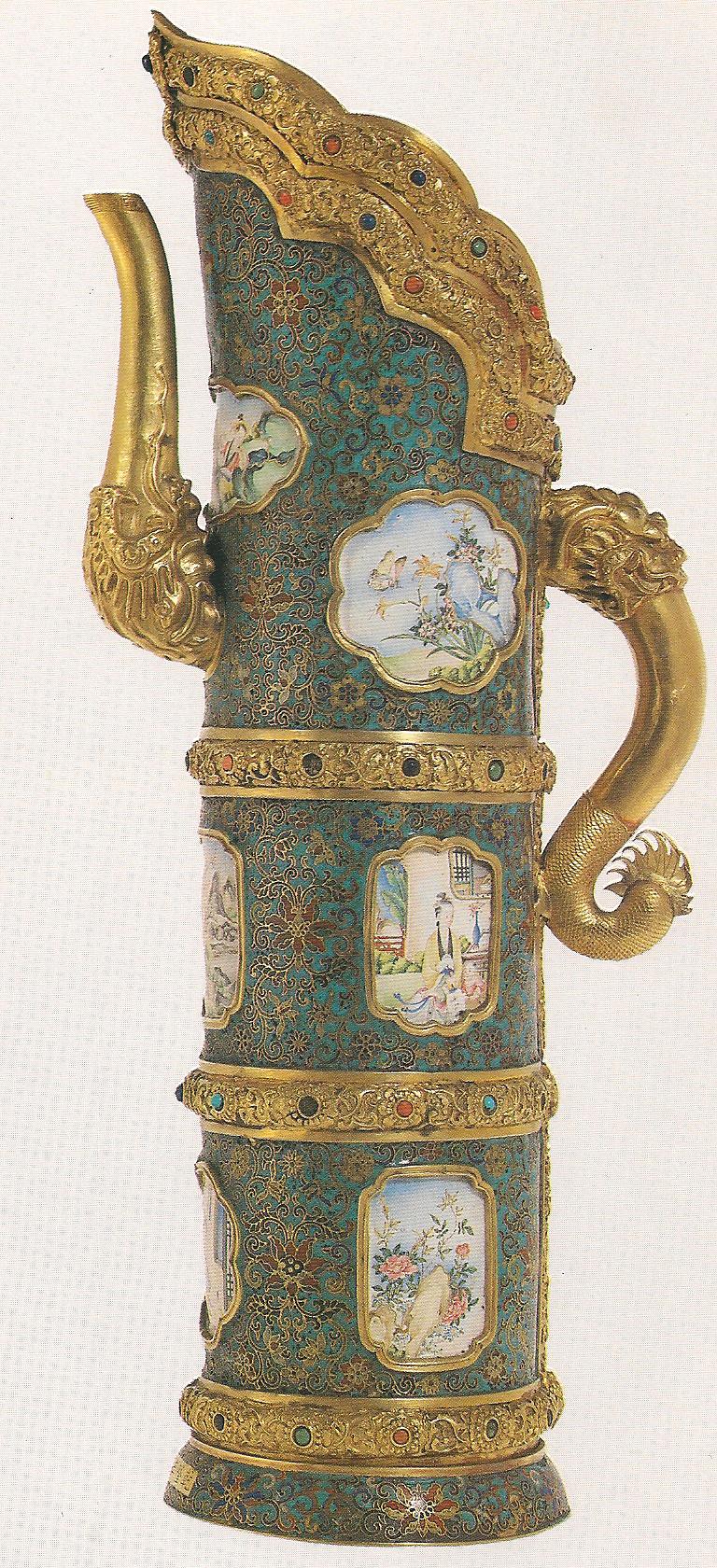 Ил.116. Чайник домоху. Золото, расписная и перегородчатая эмаль, гравировка, инкрустация кабошонами самоцветов. Китай, марка и период Цяньлун [187, № 291].