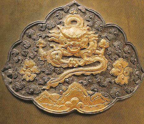 Ил.118. Пластина с изображением дракона в фигурных картушах (фрагменты декоративной отделки духового музыкального инструмента). Медь, чеканка, золочение. Тибет, период Цин. Тибетский музей, Лхаса [282, с. 54 - 55].