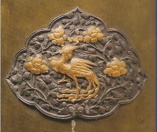 Ил.118. Пластина с изображением феникса в фигурных картушах (фрагменты декоративной отделки духового музыкального инструмента). Медь, чеканка, золочение. Тибет, период Цин. Тибетский музей, Лхаса [282, с. 54 - 55].