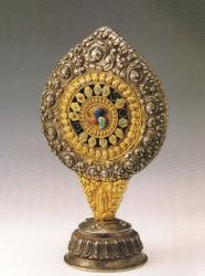 Ил.121. Колесо Учения (часть алтарного набора ?). Серебро, коралл, лазурит, бирюза, литье, чеканка, гравировка, золочение, инкрустация. Тибет, XIX в. [175, ил. 62].