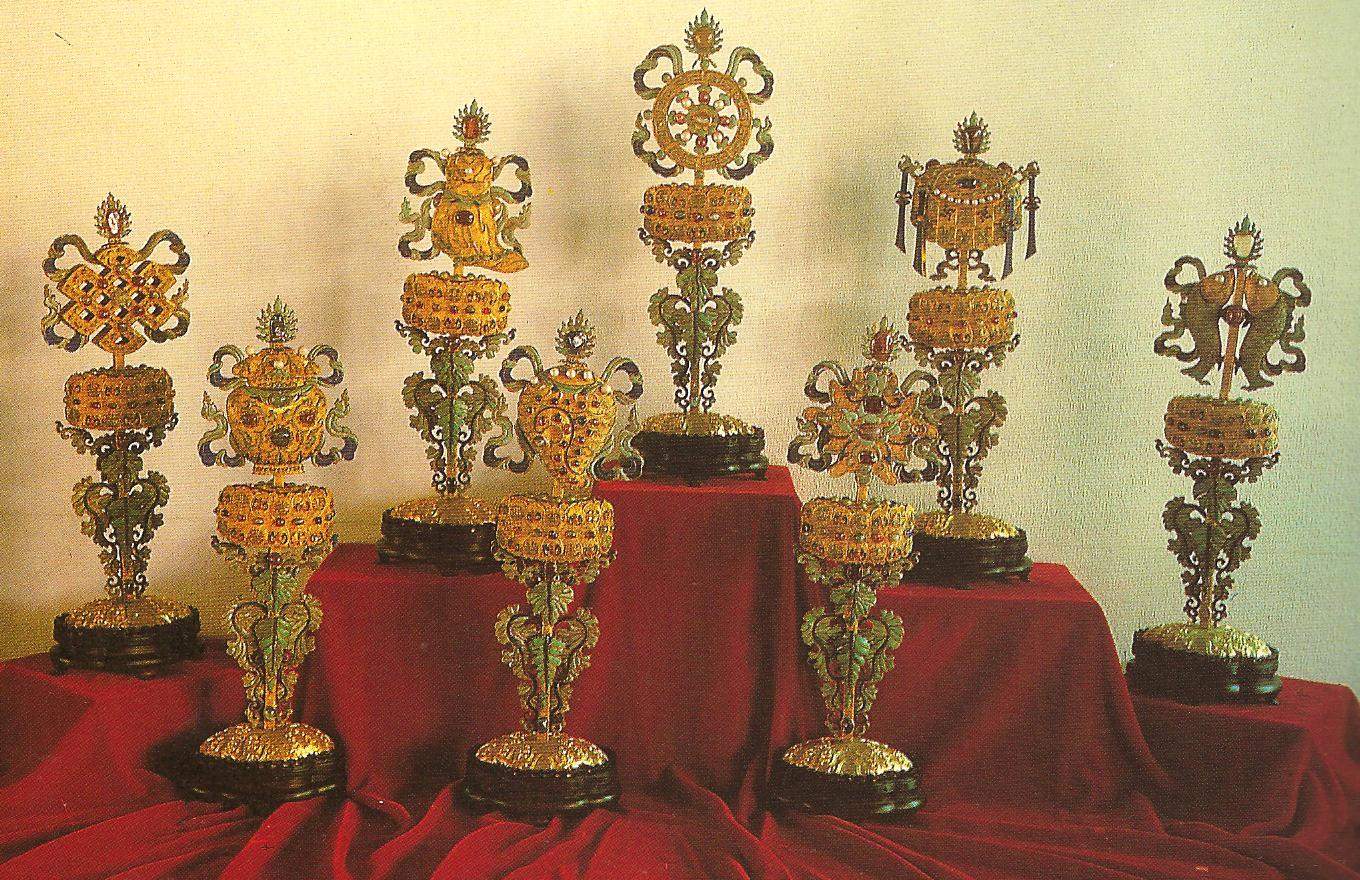 Ил.126. Алтарный набор бацзисян – «восемь [буддийских] сокровищ». Золото, жемчуг, цветные камни, чеканка, гравировка. Китай, конец XVIII в. Музей Гугун, Пекин [162, с. 116].