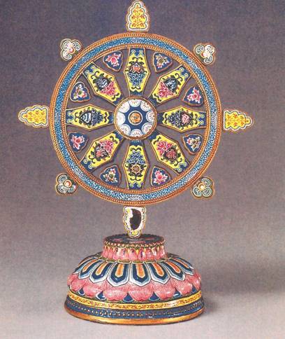 Ил.127. Колесо Учения (часть алтарного набора ?). Металл, расписная эмаль. Китай, марка и правление Юнчжэн (1723-1735). Музей Гугун, Пекин [160, с. 205].