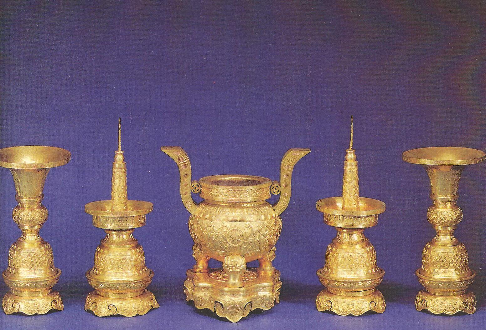 Ил.128. Алтарный набор угун – «пять даров/даней». Металл, литье, чеканка, гравировка, золочение. Китай, период Цяньлун [180, т. 21, № 3, с. 61].