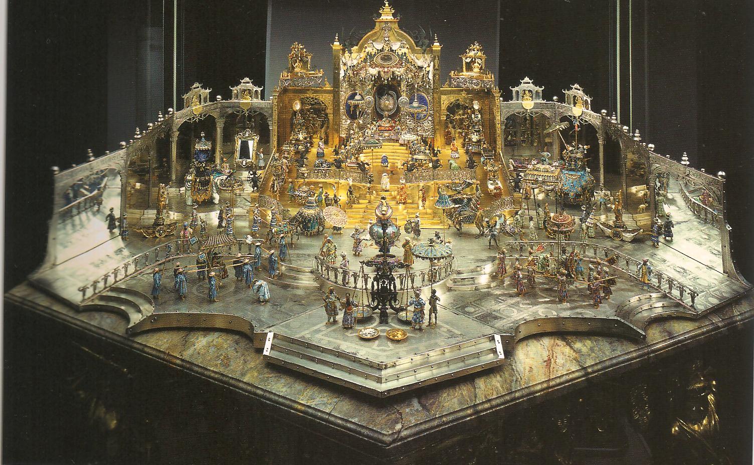 Ил.131. И.-М. Динглингер и мастерская. Настольное украшение «Двор Великого Могола Аурангзеба». Дерево, золото, серебро, драгоценные камни, жемчуг, лаковая живопись, эмаль. Дрезден, 1701-1708. Собрание Музея Зеленые Своды. Дрезден [Кабинет драгоценностей Августа Сильного (каталог выставки). М., 2006, с. 22, ил. 11].
