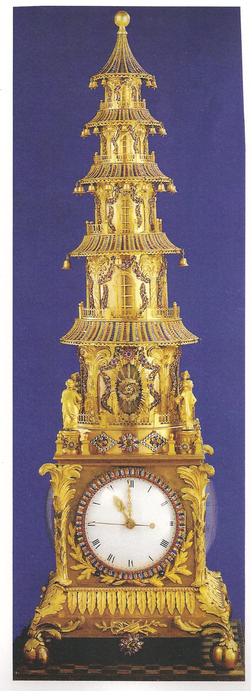 Ил.135. Механические часы в виде пагоды. Бронза, ювелирые камни, литье, золочение, инкрустация. Англия, 1780. Музей Гугун, Пекин [164, с. 178].