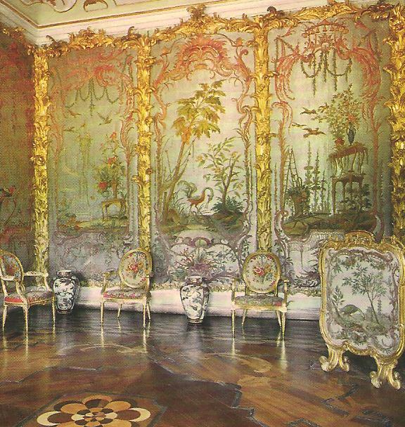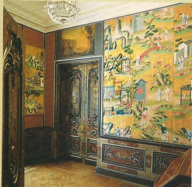 Ил.151. Интерьер спальни с шелковыми обоями, изображающими китайские жанровые сцены. 1762. Дворец Петра III (архитектор А.Ринальди, 1758-1762). Ораниенбаум, Санкт-Петербург.
