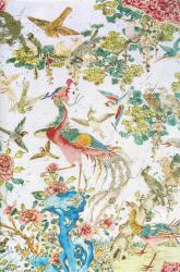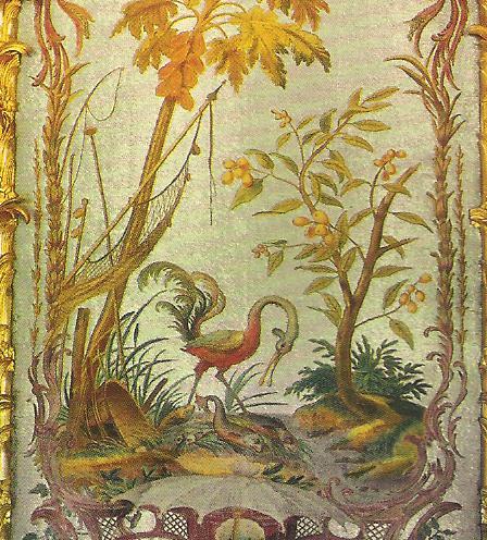 Ил.139. Фрагмент отделки Стеклярусного кабинета – деталь настенного панно с изображением цветов и птиц. Вышивка синелью (разноцветным ворсистым шелком по фону из трубочек перламутрового стекла). 1762-1764. Ораниенбаум, Санкт-Петербург.