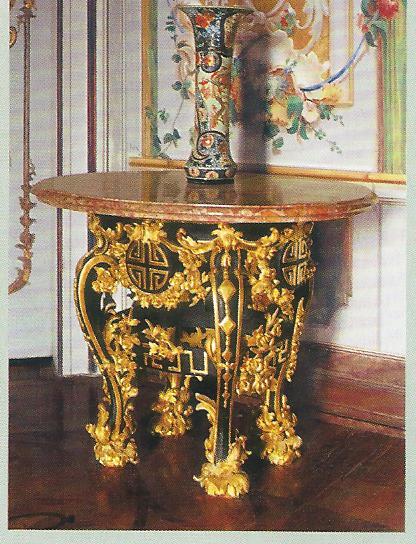 Ил.141. Передняя Китайского дворца. Стол. Дерево, резьба, имитация китайского лака, золочение. Россия, XVIII в. Ваза. Фарфор, роспись. Япония, XVIII в. Ораниенбаум, Санкт-Петербург.