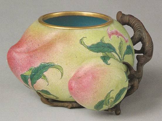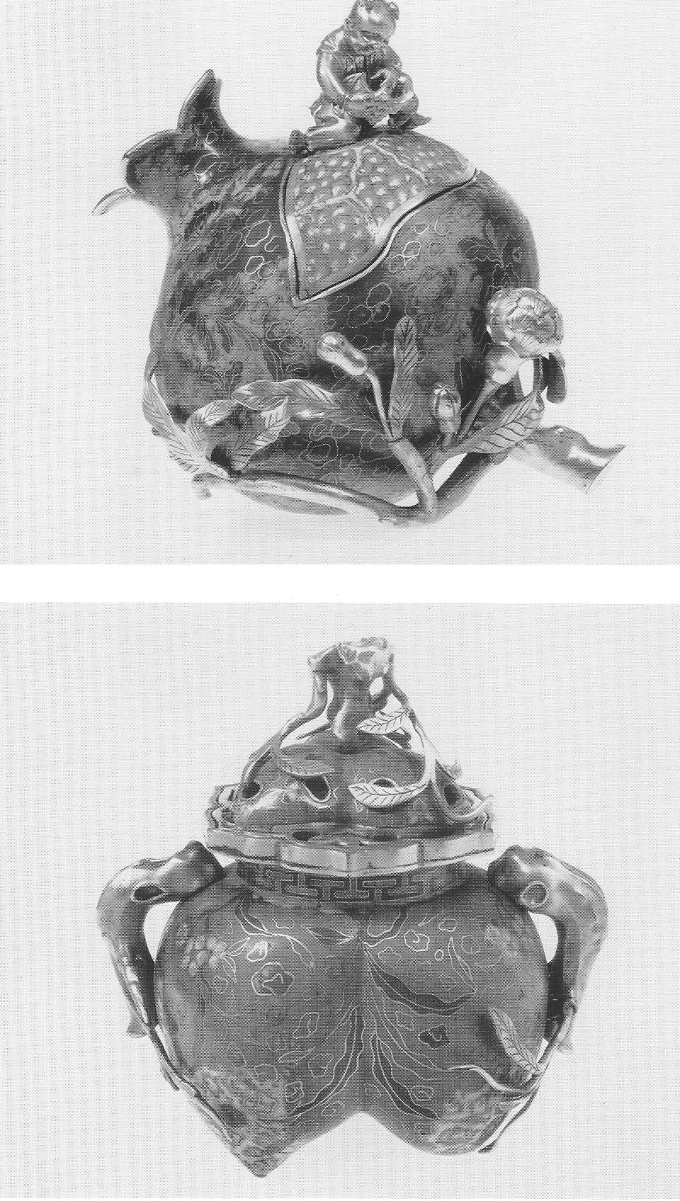 Ил.144. Вверху: Коробочка в виде плода граната. Внизу: Курильница в виде плода с ручками-веточками. Обе – металл, перегородчатая эмаль, золочение. Китай, период Цяньлун, вторая половина XVIII в. [187, № 292, 293].