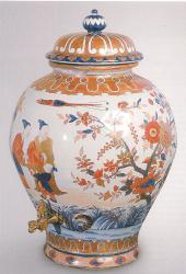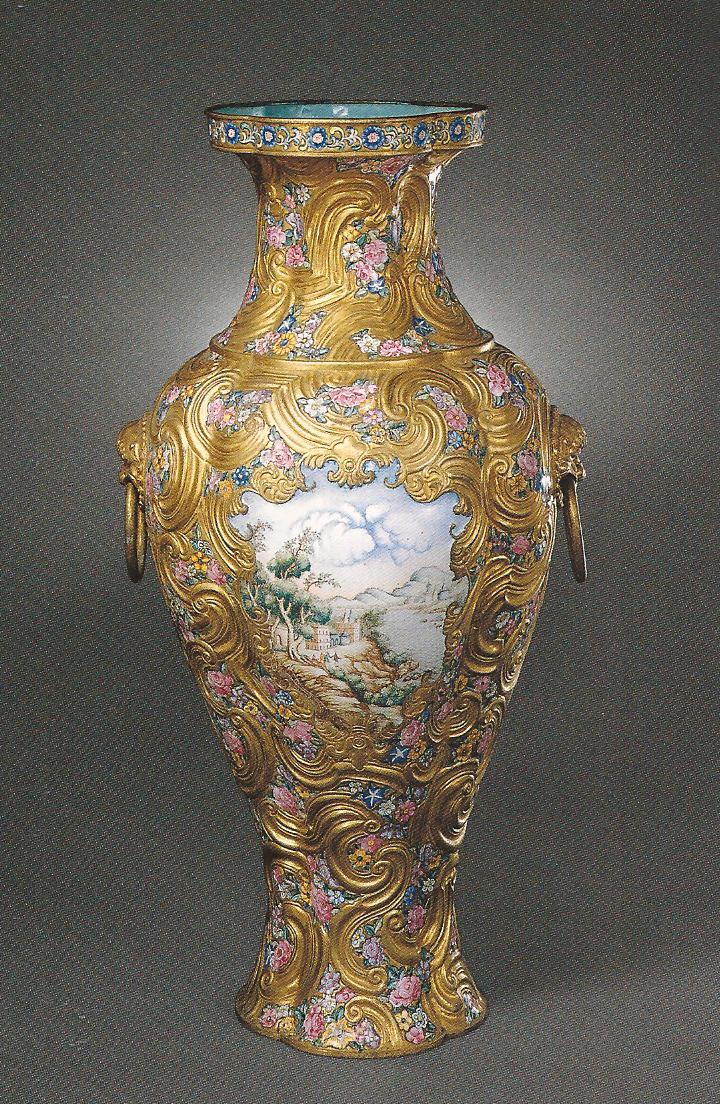 Ил.145. Ваза с крышкой. Фарфор, полихромная роспись по рисунку К. Пронка. Китай, 1736 - 1740-е гг. (бронзовая оправа европейской работы превратила вазу в рукомойник). ГЭ, Санкт-Петербург [64, № 45].
