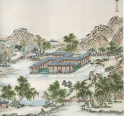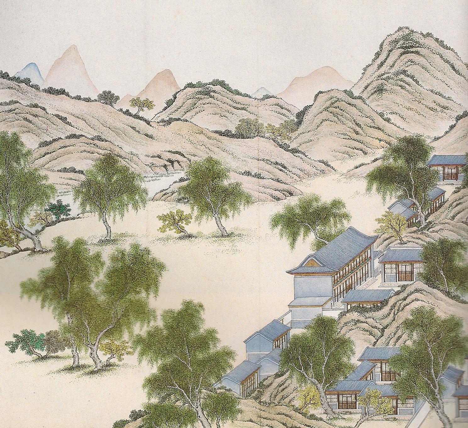Ил.159. Вид китайской части дворцово-паркового комплекса Юаньминъюань. Шелк, полихромная живопись. Китай, период Цин [165, с. 274-275].