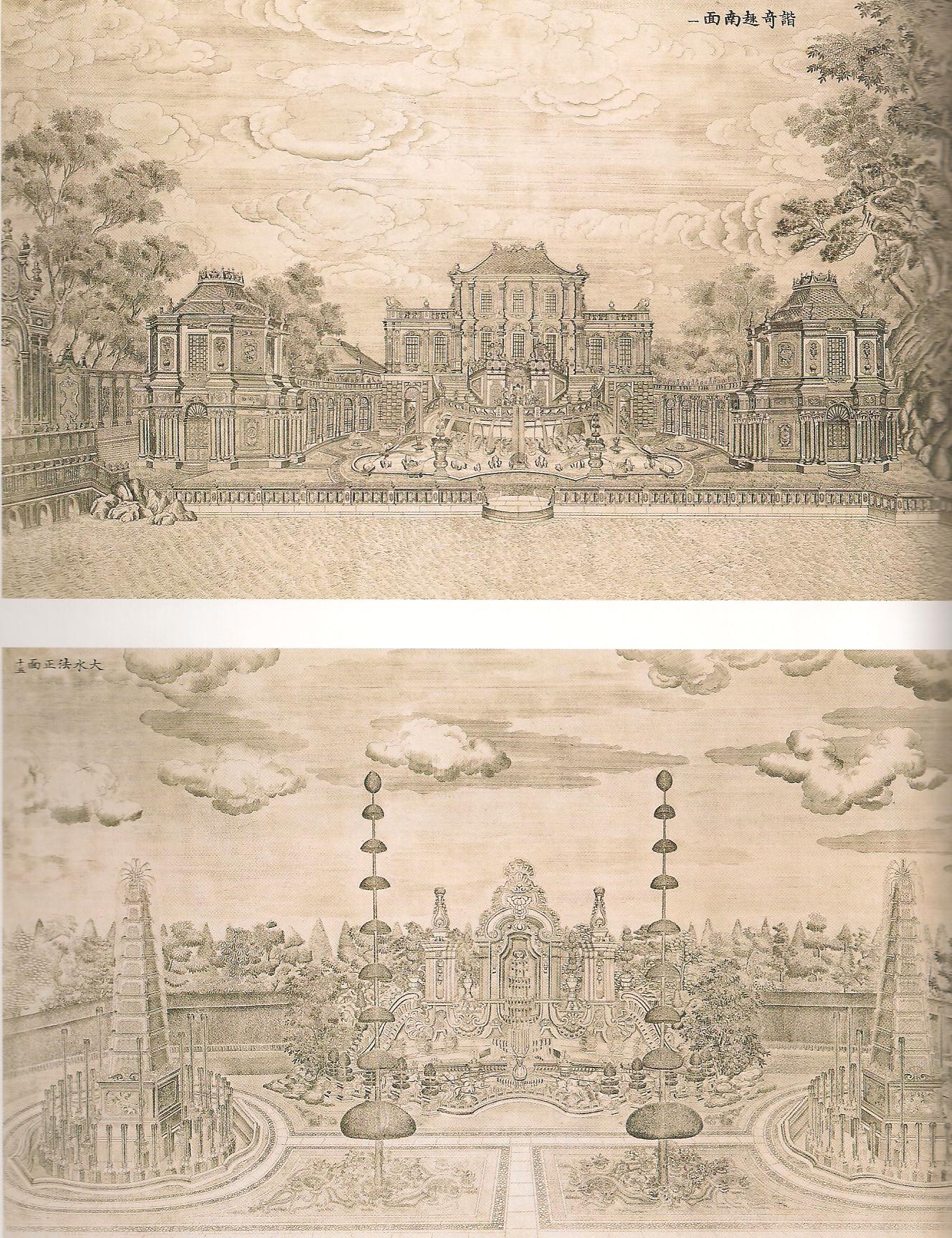 Ил.160. Лан Шинин (Дж. Кастильоне) и придворные художники студии Жуигуань. Листы с изображением видов европейского дворца в комплексе Юаньминъюань. Гравюра на меди, Китай, 1783 [206, с. 125, 128].