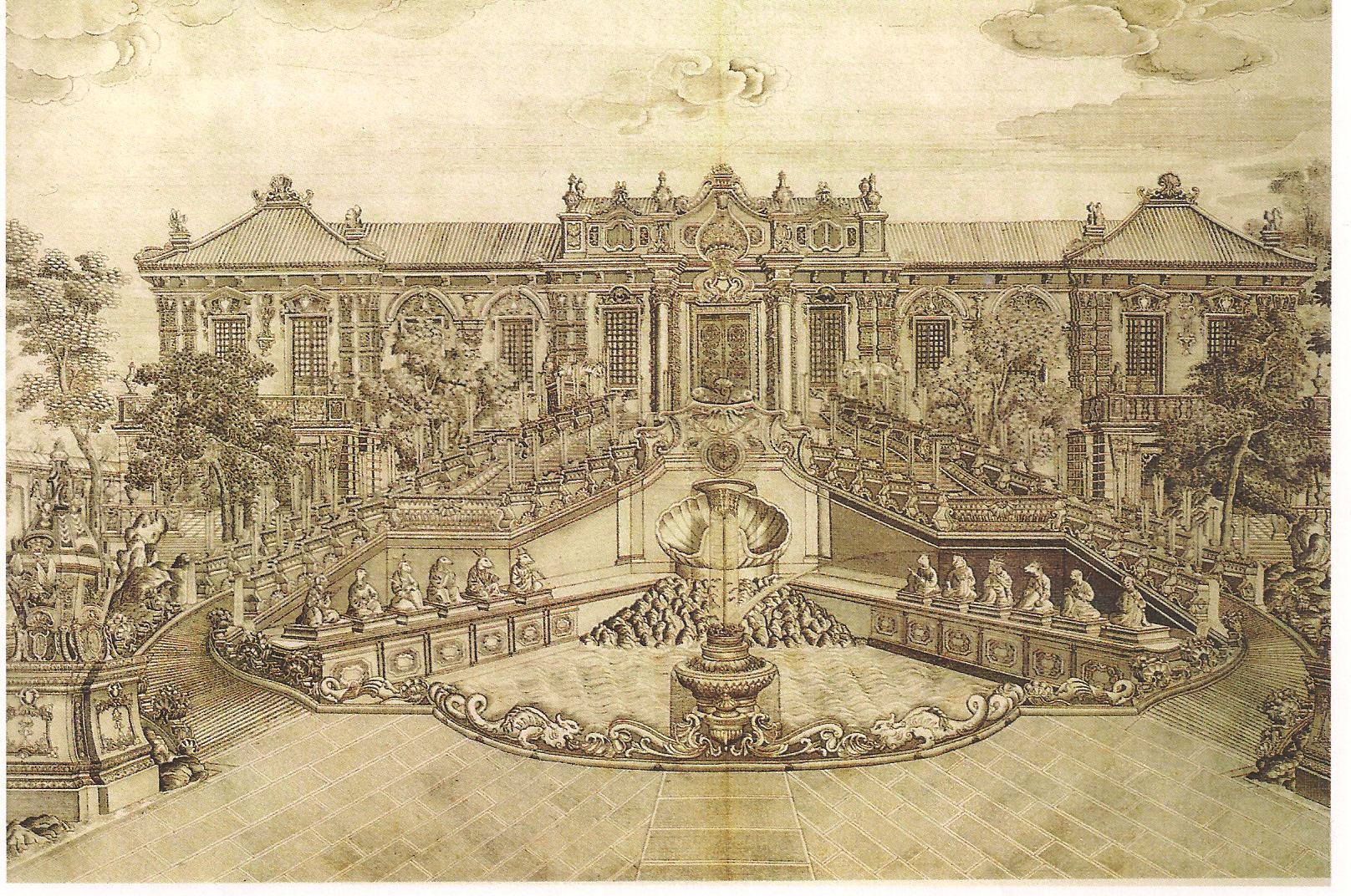Ил.161. Лан Шинин (Дж. Кастильоне) и придворные художники студии Жуигуань. Гравюра на меди с изображением дворца «Зал тихих морей» в европейской части Юаньминъюань [206, с. 128].