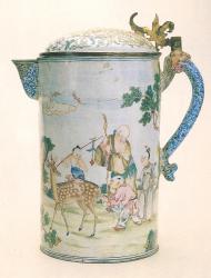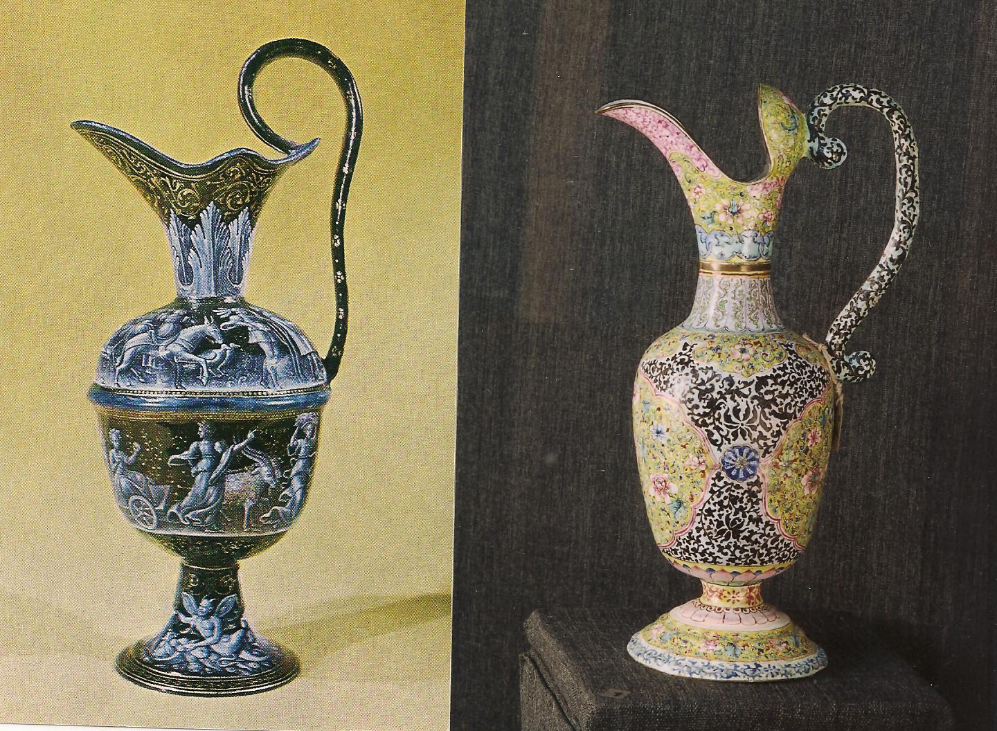 Ил.169. Слева: Кувшин с аллегорическими изображениями зимы и осени. Металл, эмаль, монохромная живопись en grisaille. Мастерская П. Раймона, Франция, Лимож, первая четверть XVI в. ГЭ, Санкт-Петербург [40, № 38]. Справа: Кувшин (из умывального набора). Металл, эмаль, полихромная роспись. Мастерские Кантона/Гуанчжоу, начало правления Цяньлун. ГИКМЗ «Московский Кремль» (инв. № 16032 охр).