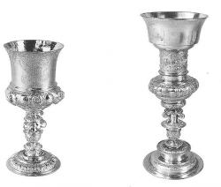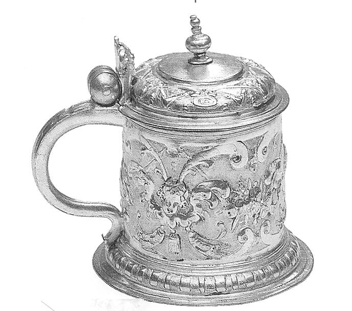 Ил.173. Кружка с откидной крышкой на шарнире. Серебро, литье, чеканка, золочение. Польша, начало XVII в. [Польское художественное серебро XVII - первой половины XIX века в Эрмитаже (каталог выставки). СПб., 2004, с. 90].