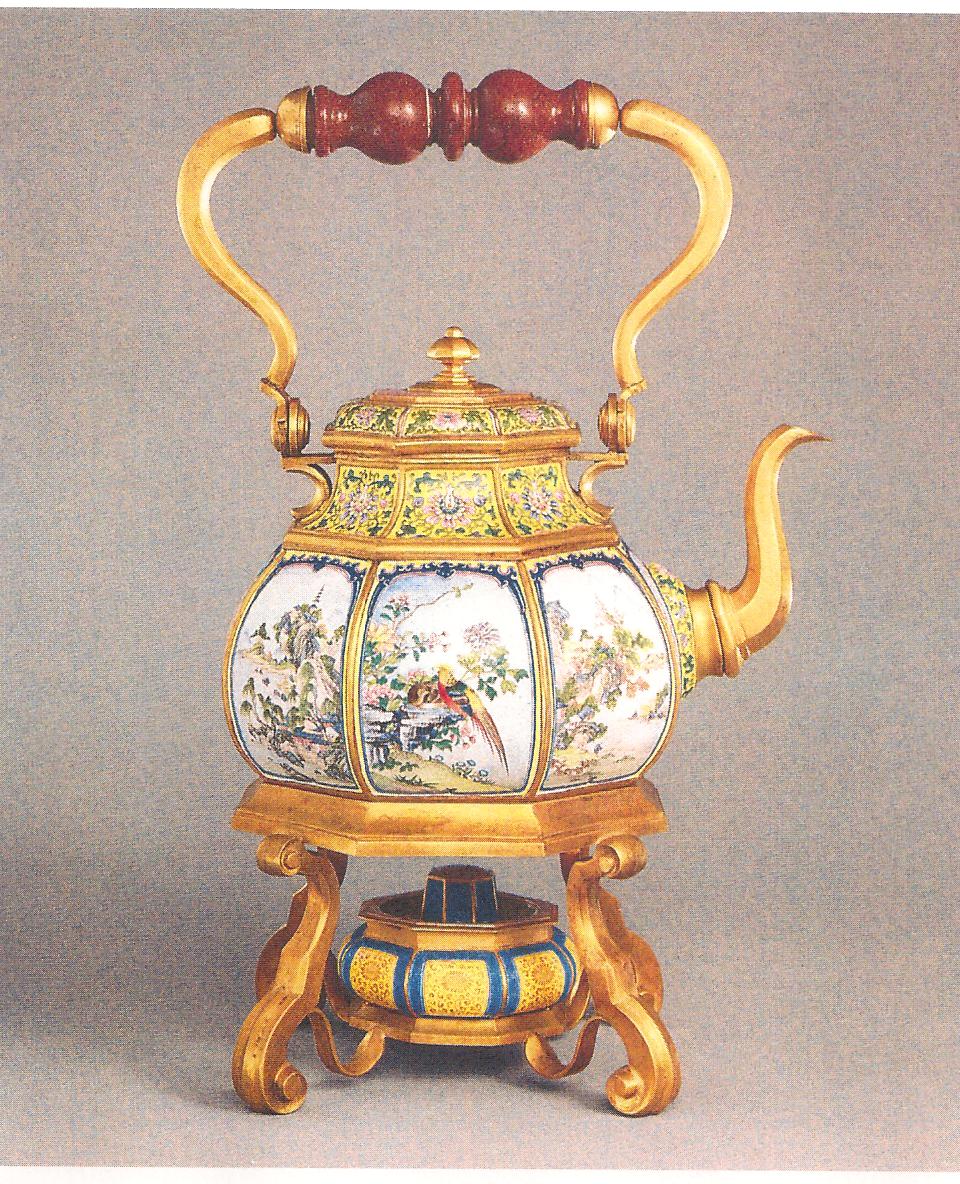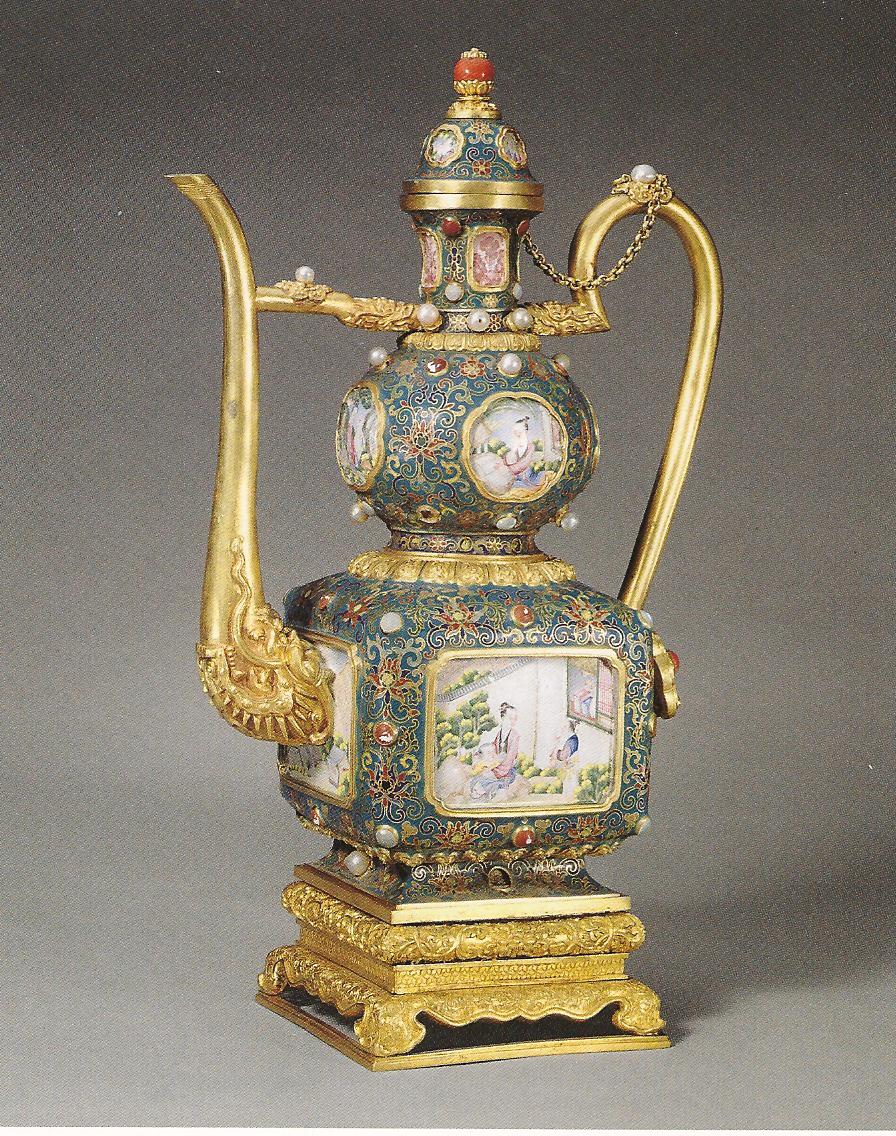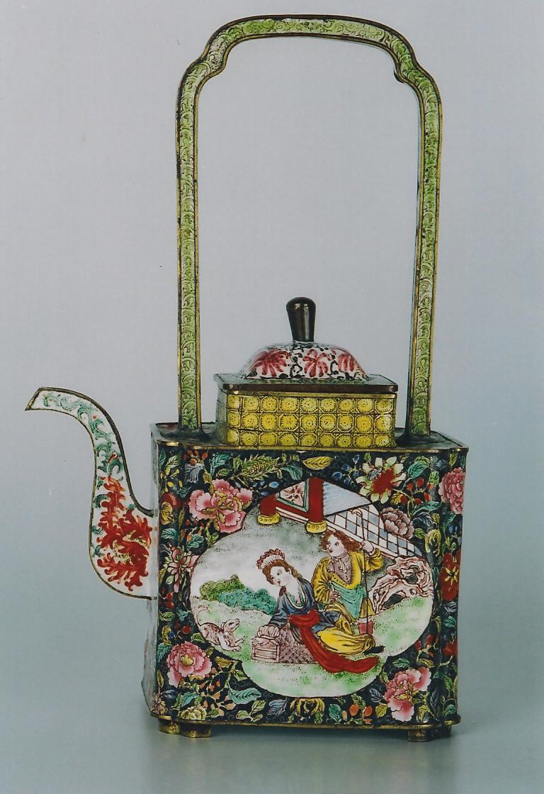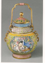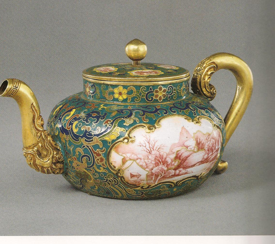 Ил.228. Чайник с живописными пейзажами en grisaille в картушах. Металл, перегородчатая и расписная эмаль, золочение. Китай, марка и период Цяньлун. Музей Гугун, Пекин [160, № 106].