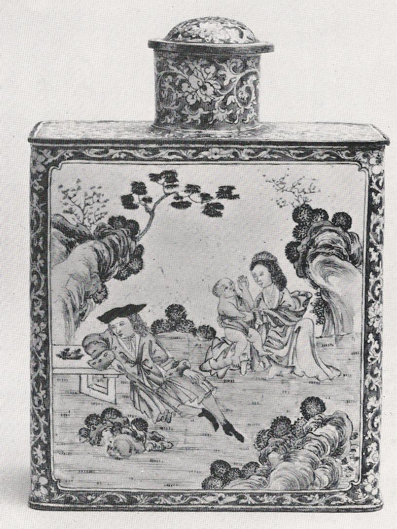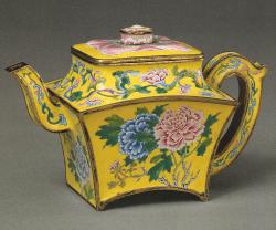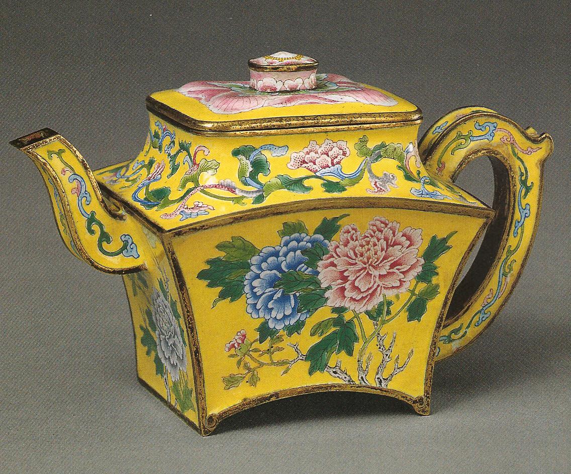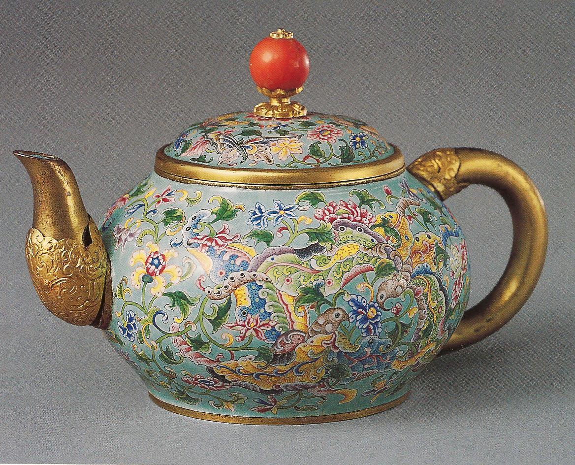 Ил.228. Чайник с живописными пейзажами en grisaille в картушах. Металл, перегородчатая и расписная эмаль, золочение. Китай, марка и период Цяньлун. Музей Гугун, Пекин [160, № 106].