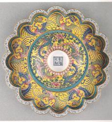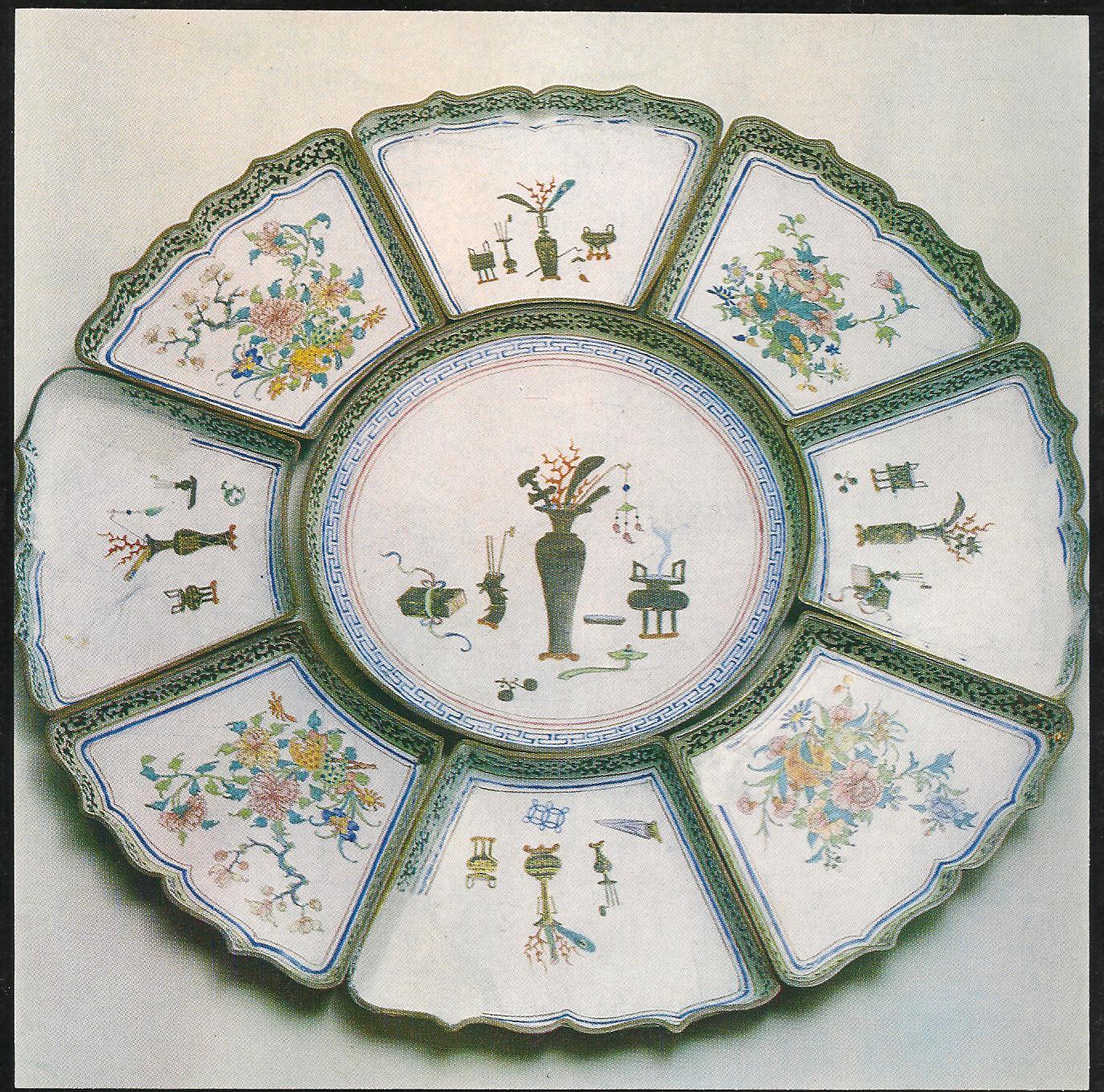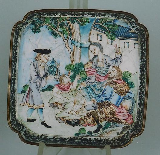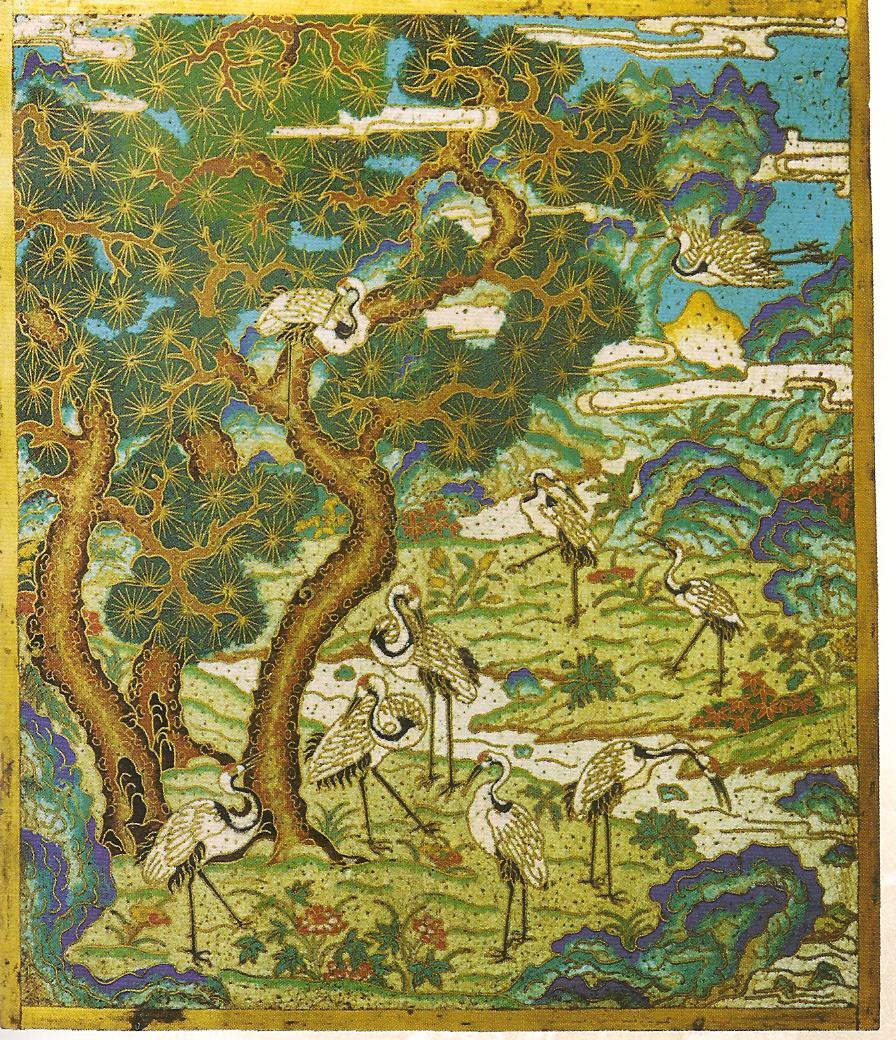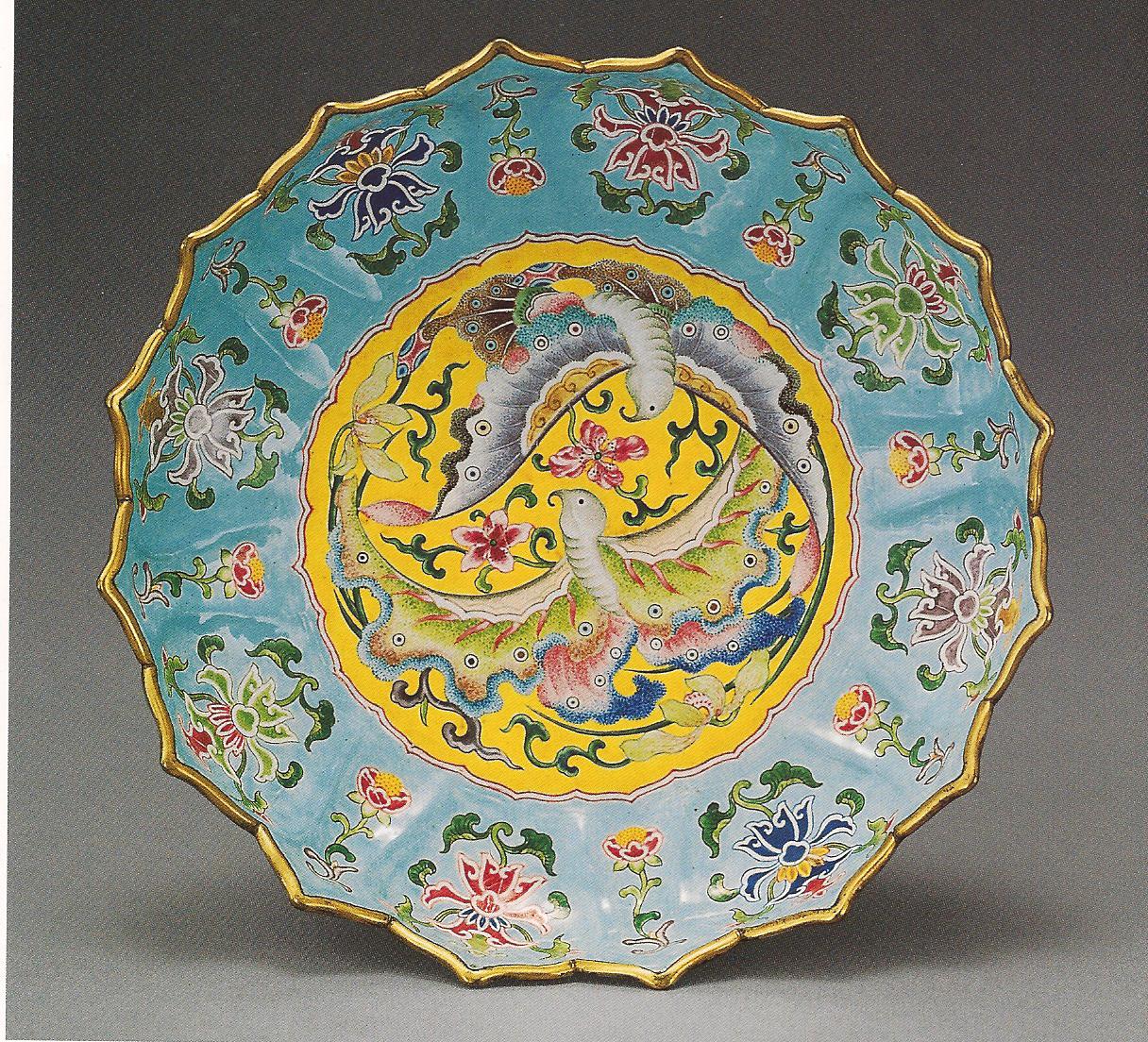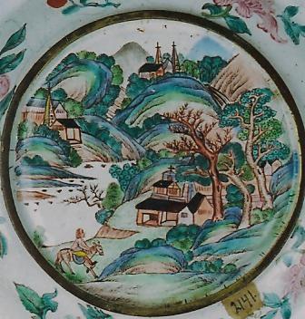 Ил.225. Пластина с изображением пейзажа. Металл, перегородчатая эмаль, золочение. Китай, период Цяньлун. ГМВ, Москва (инв. № 3425 I) [98, № 19].