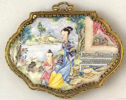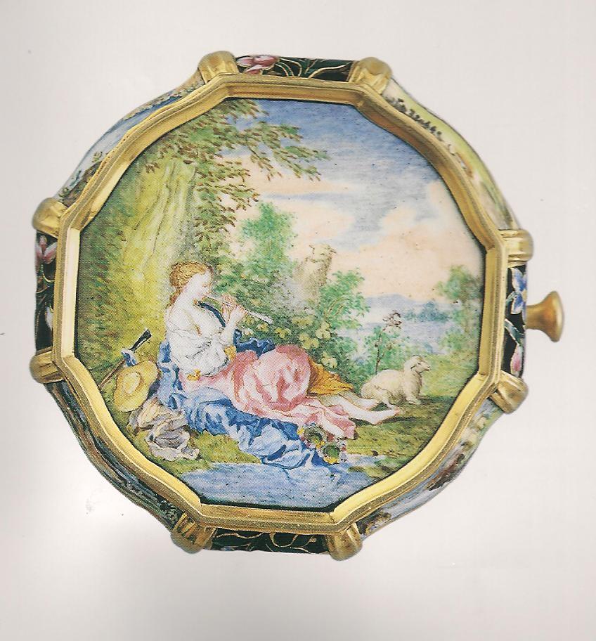 Ил.239. Часы (одни из пары) с изображением пасторалей на крышке. Золоченая бронза, стекло, расписная эмаль, гравировка. Англия, Лондон, XVIII в. Музей Гугун, Пекин [164, с. 209].