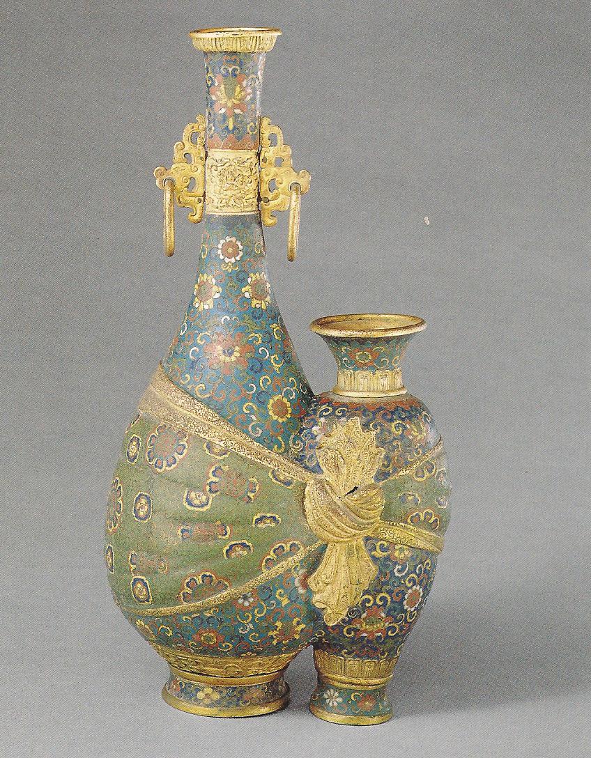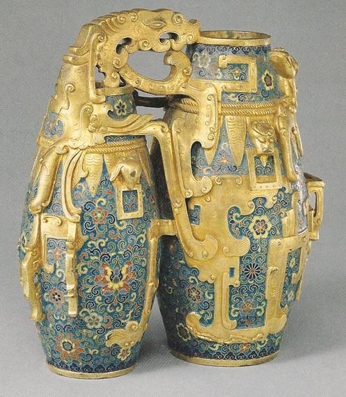 Ил.227. Двойные вазы с драпировкой и рельефными ручками в «чжоуском стиле». Металл, перегородчатая эмаль, гравировка, золочение. Китай, марка и период Цяньлун. Музей Гугун, Пекин [160, № 98].