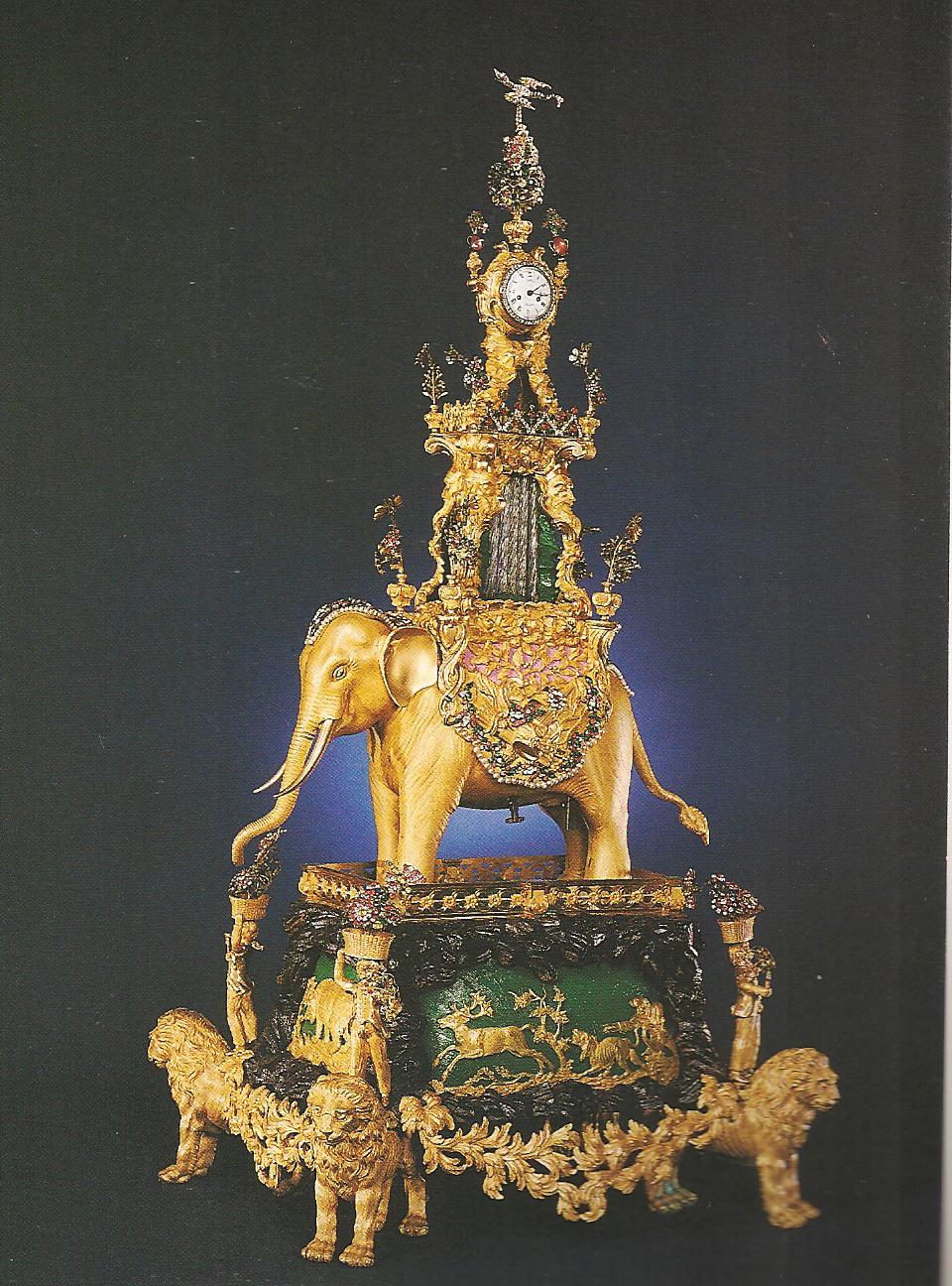 Ил.232. Часы в виде слона с фонтаном и вазами на спине. Бронза, цветные камни и стразы, стекло, литье, резьба, гравировка, золочение, инкрустация. Мастер Дж. Кокс, Англия, 1770. Музей Гугун, Пекин [164, с. 103].