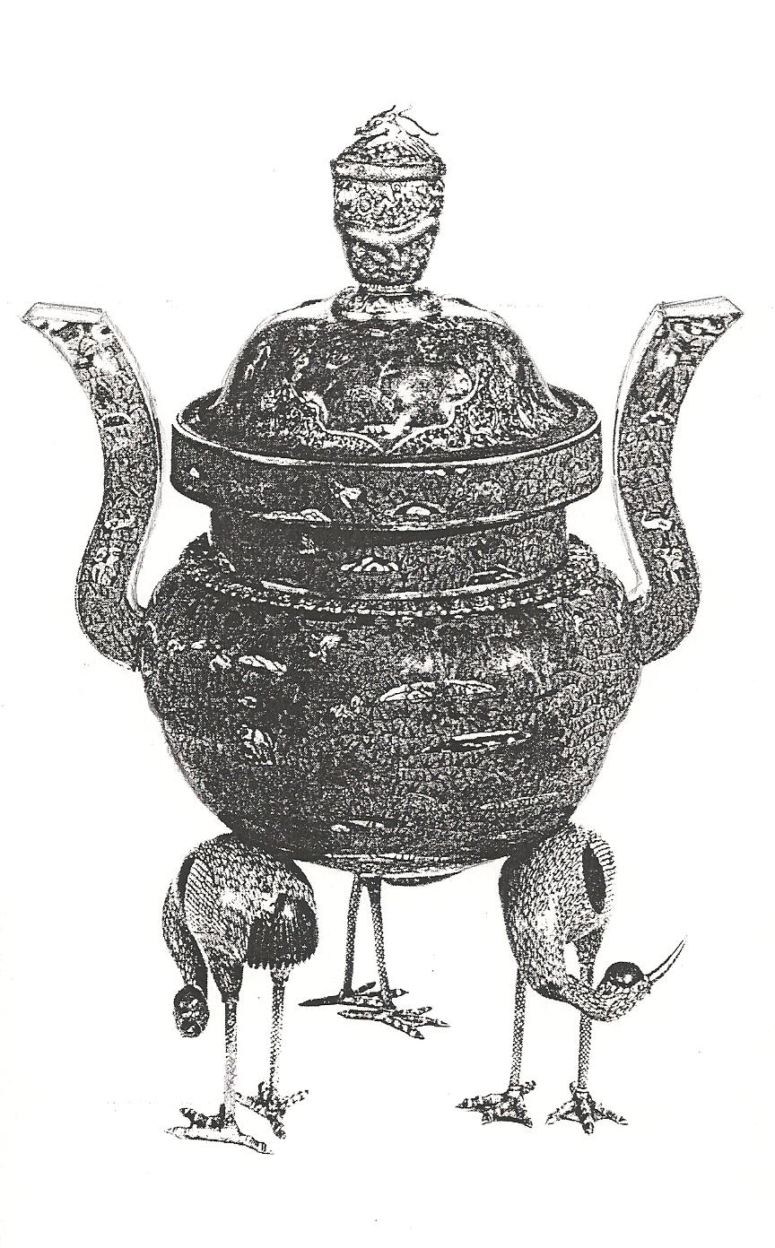 Ил.234. Курильница-треножник со скульптурными ножками в виде журавлей. Бронза, литье, резьба, гравировка, перегородчатая эмаль, золочение. Китай, вторая половина XVIII в. [187, № 323].