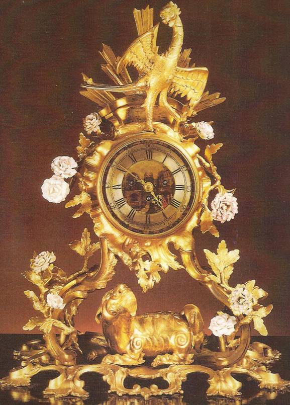 Ил.235. Часы в оправе в виде куста пионов со скульптурными изображениями феникса и цилиня. Бронза, стекло, фарфор, литье, гравировка, золочение. Мастер Т. Гарднер, Англия, XVIII в. Музей Гугун, Пекин [164, с. 133].