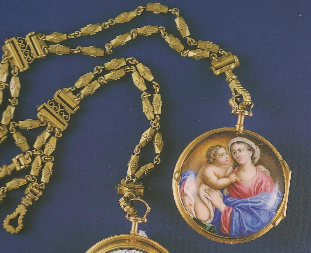 Ил.238. Часы парные на шатленах с изображением мадонны и младенца на крышке. Золоченая бронза, стекло, расписная эмаль, гравировка. Мастер Т. Хантер, Англия, XVIII в. Музей Гугун, Пекин [164, с. 132].