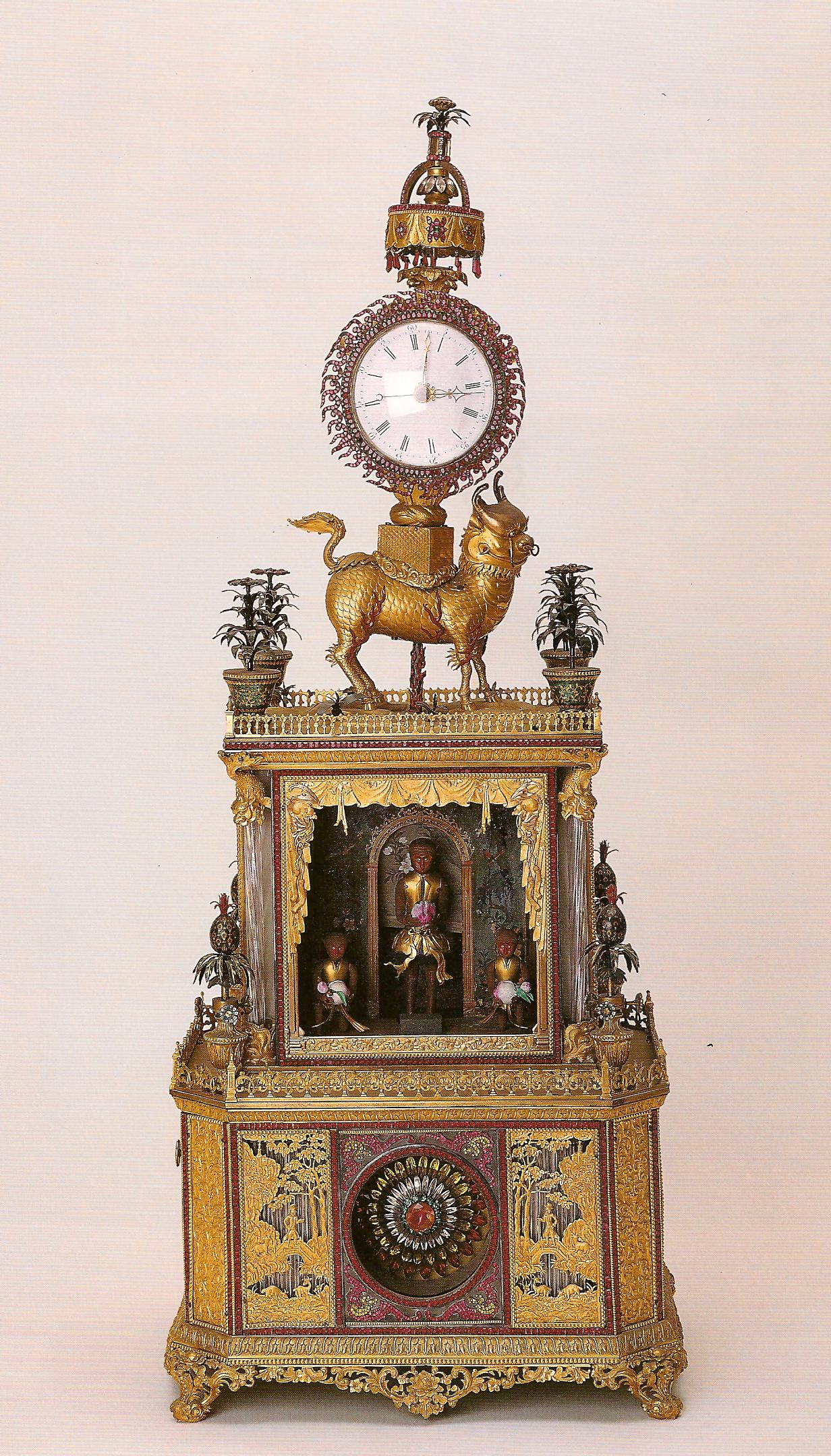 Ил.244. Часы-павильон с театром механических кукол и фигурой цилиня под балдахином. Бронза, живописный лак, стекло, цветные камни и стразы, эмаль, литье, гравировка, золочение, инкрустация. Мастерские Кантона/Гуанчжоу, период Цяньлун. Музей Гугун, Пекин [164, с. 73].