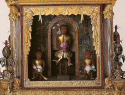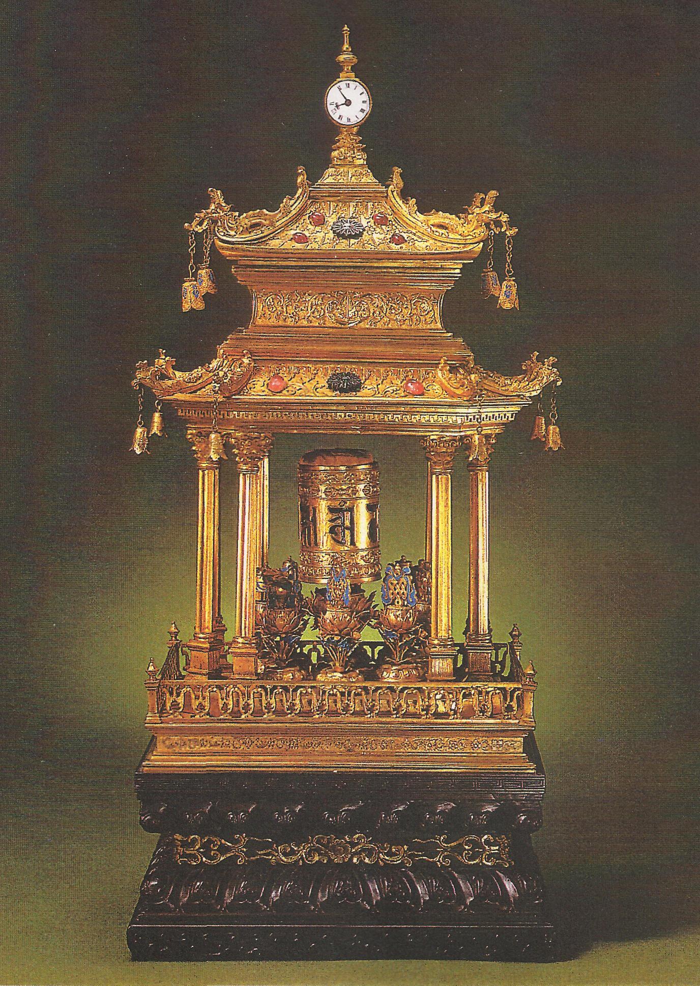 Ил.256. Часы-беседка с молитвенным барабаном и изображениями буддийских «драгоценностей». Бронза, стекло, цветные камни, литье, чеканка, гравировка, золочение, инкрустация. Пекинские придворные мастерские, период Цяньлун. Музей Гугун, Пекин [164, с. 43].