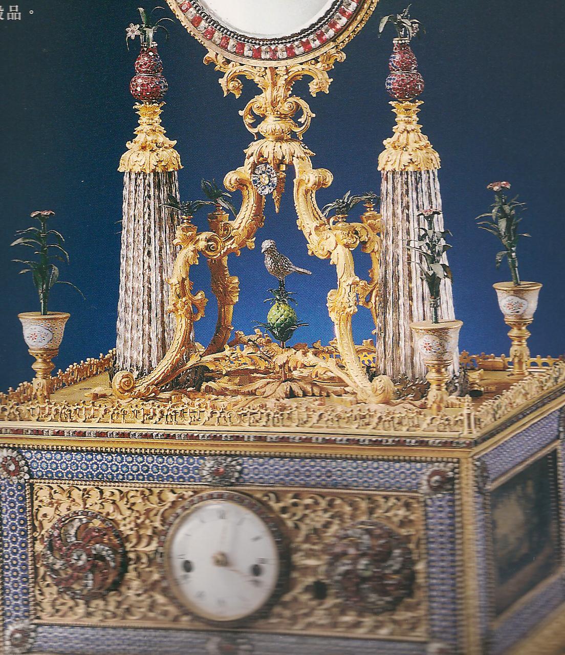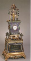 Ил.251. Фрагмент часовой оправы с фонтанами и фейерверочными звездами в верхней части обелисков. Бронза, стекло, цветные камни и стразы, расписная эмаль, литье, гравировка, золочение, инкрустация. Мастер Вильямсон, Англия, 1780 - 1795. Музей Гугун, Пекин [164, с. 139].